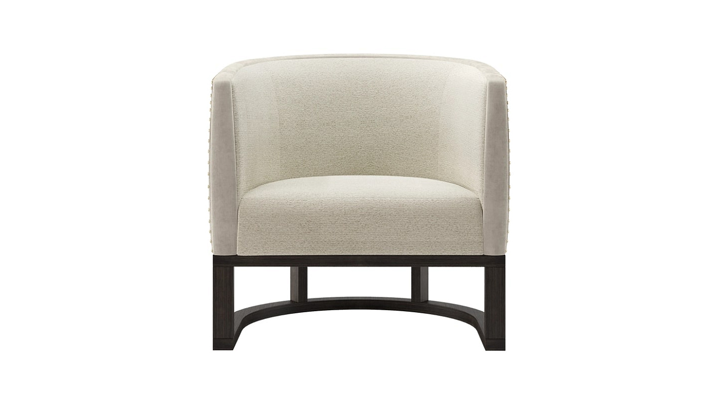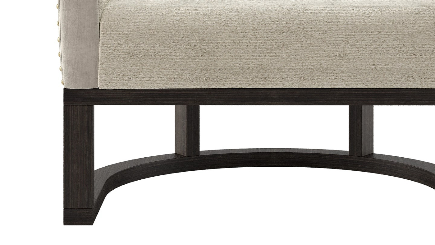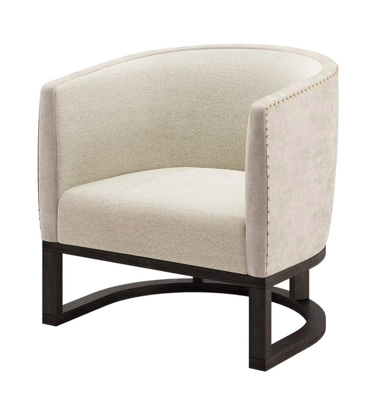 Кресло LINZ в форме широкой подковы вполне может принести вам удачу. Его элегантное сиденье, обитое контрастными тканями и украшенное металлическими заклепками по шву, расположено на архитектурном основании, вырезанном из цельного дерева.