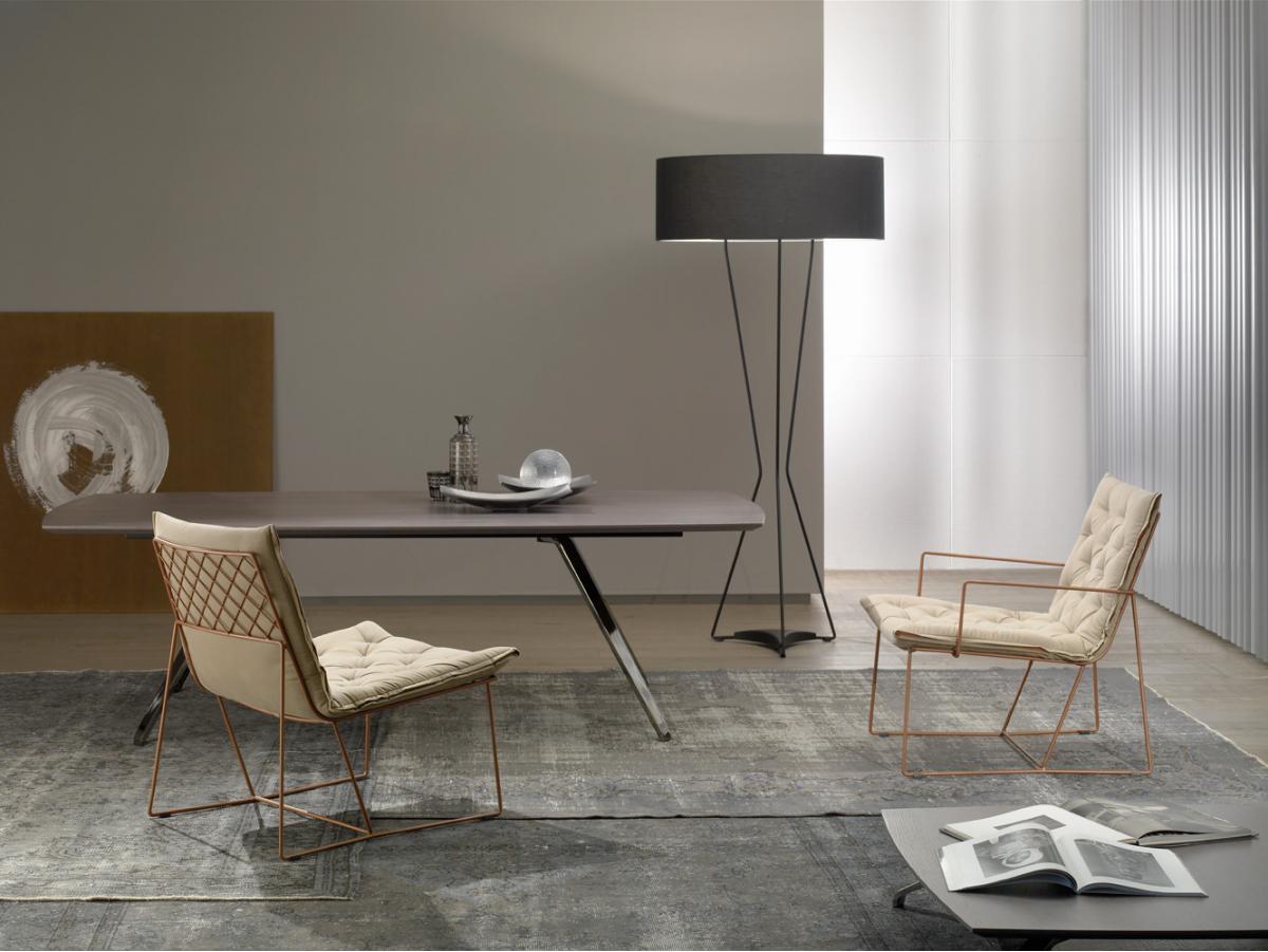 Коллекция Syrma, это идея получить визуально легкий продукт. Этот эффект достигается за счет металлической сетки сиденья и спинки и стержней, которые определяют его контур. Для достижения комфорта на сиденье закреплен коврик в Capitoné . Металлическая конструкция доступна в трех цветах (медь, белый и темно-серый). Capitoné и боковая молния сочетаются с цветом конструкции. В коллекции есть стул, кресло, высокое кресло, табуретка и пуф.