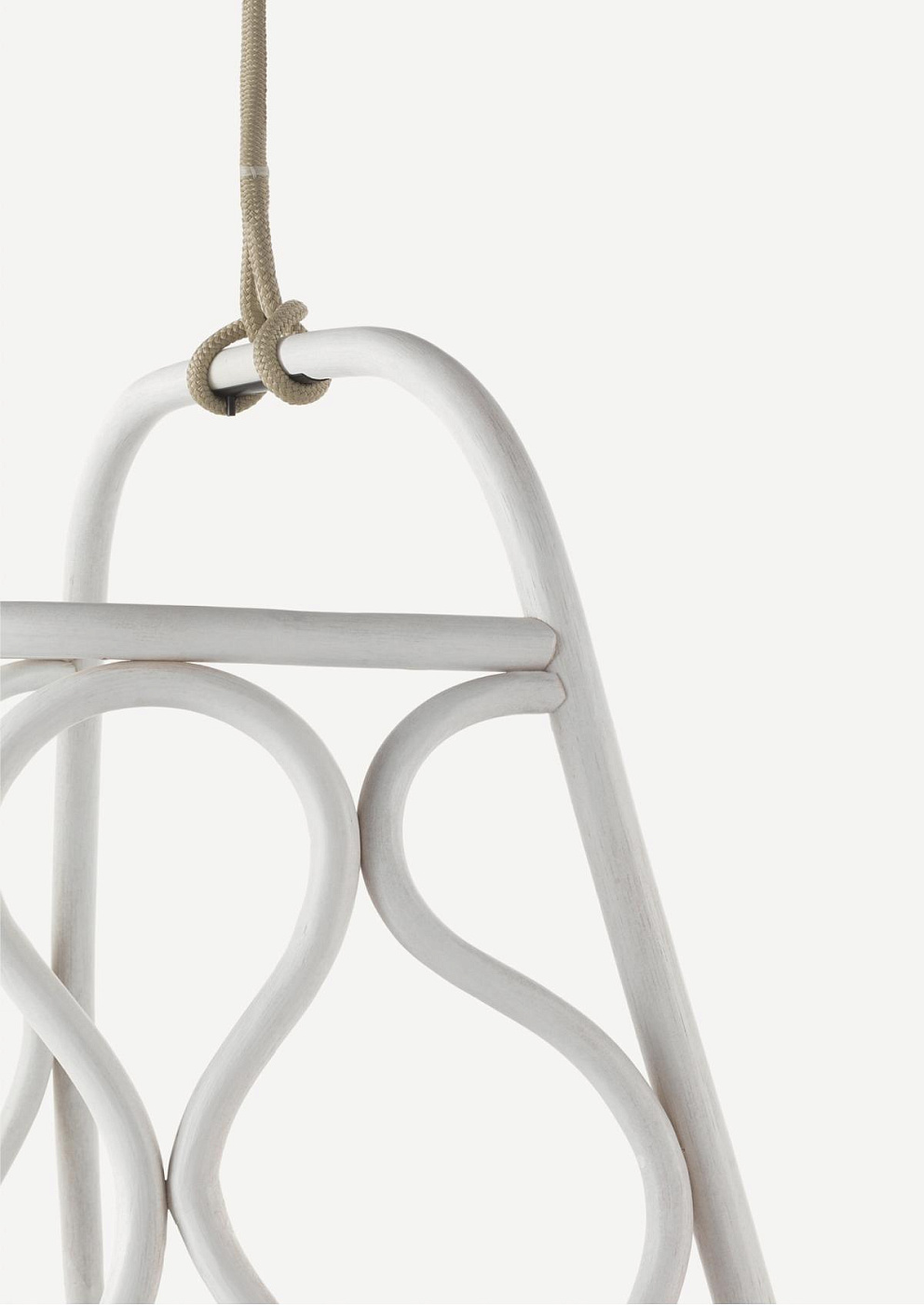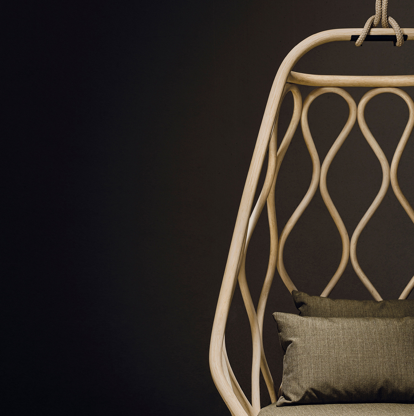 Форма кресла напоминает кокон, который плавно раскачивается на канате (сделан из прочного полимерного материала). Изящные изгибы и «завитки», выполненные из ротанга, образуют сразу спинку и сиденье, внутри которого для удобства имеется несколько подушек. Материал их обивки — прочный и износостойкий текстиль, который не потеряет своего внешнего вида после случайного намокания или воздействия солнечный лучей.