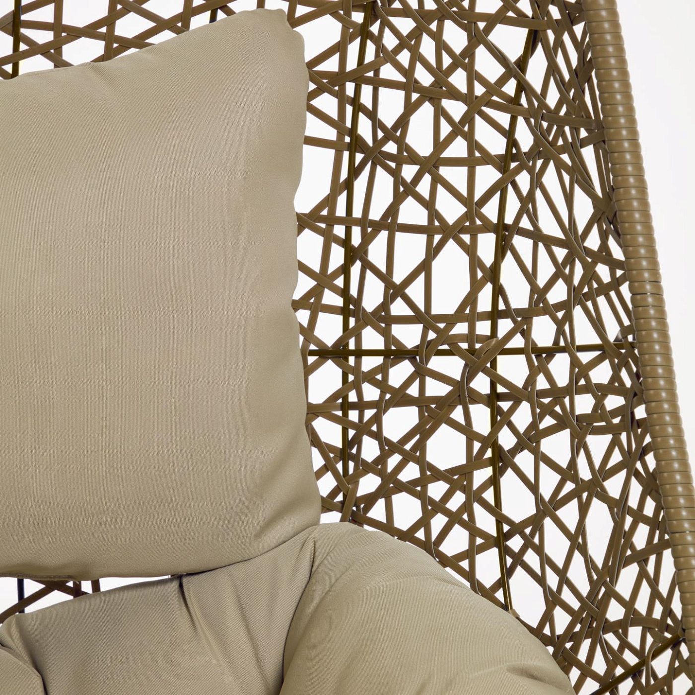 Подвесное кресло Florina состоит из металлической рамы и плетеного веревочного сиденья.