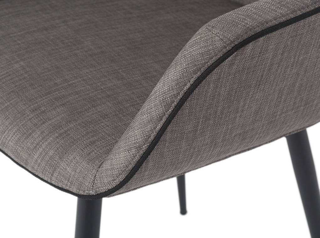 Кресло для столовой современного дизайна с подлокотниками, обитыми серой тканью и черной окантовкой. Авангардный и современный стул с черными стальными ножками, который станет обязательным в вашей столовой. Его сиденье из пенополиуретана плотностью 25 кг/м3 и обволакивающий дизайн придают ему уникальный стиль и больший комфорт.