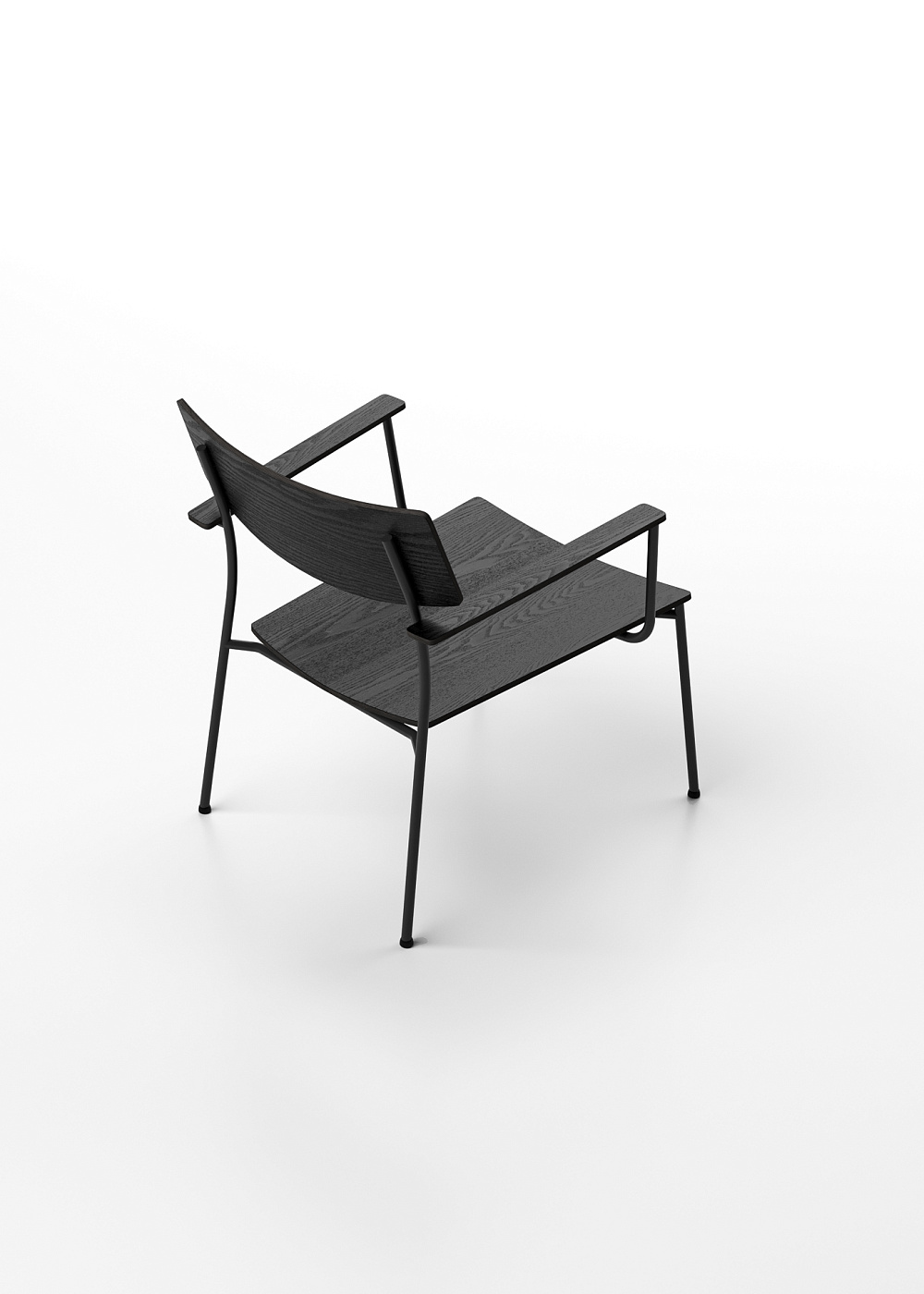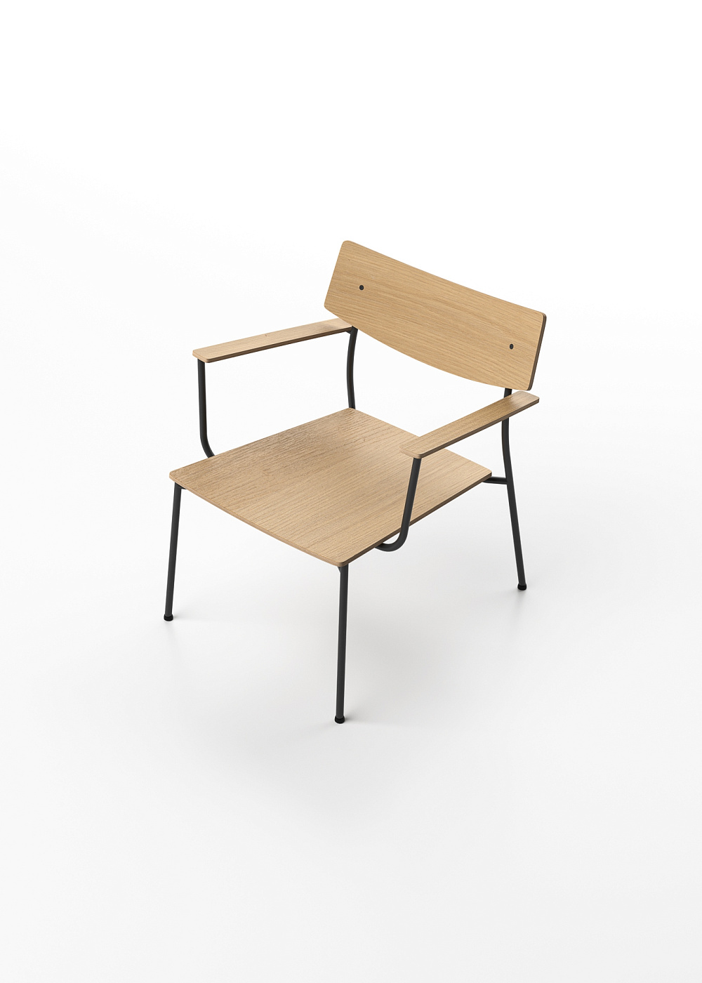 Стальная рама из трубчатой стали с черным порошковым покрытием, сиденье, спинка и подлокотники из полированной фанеры европейского дуба в различных вариантах отделки. Черные торцевые пластиковые крышки с войлоком.