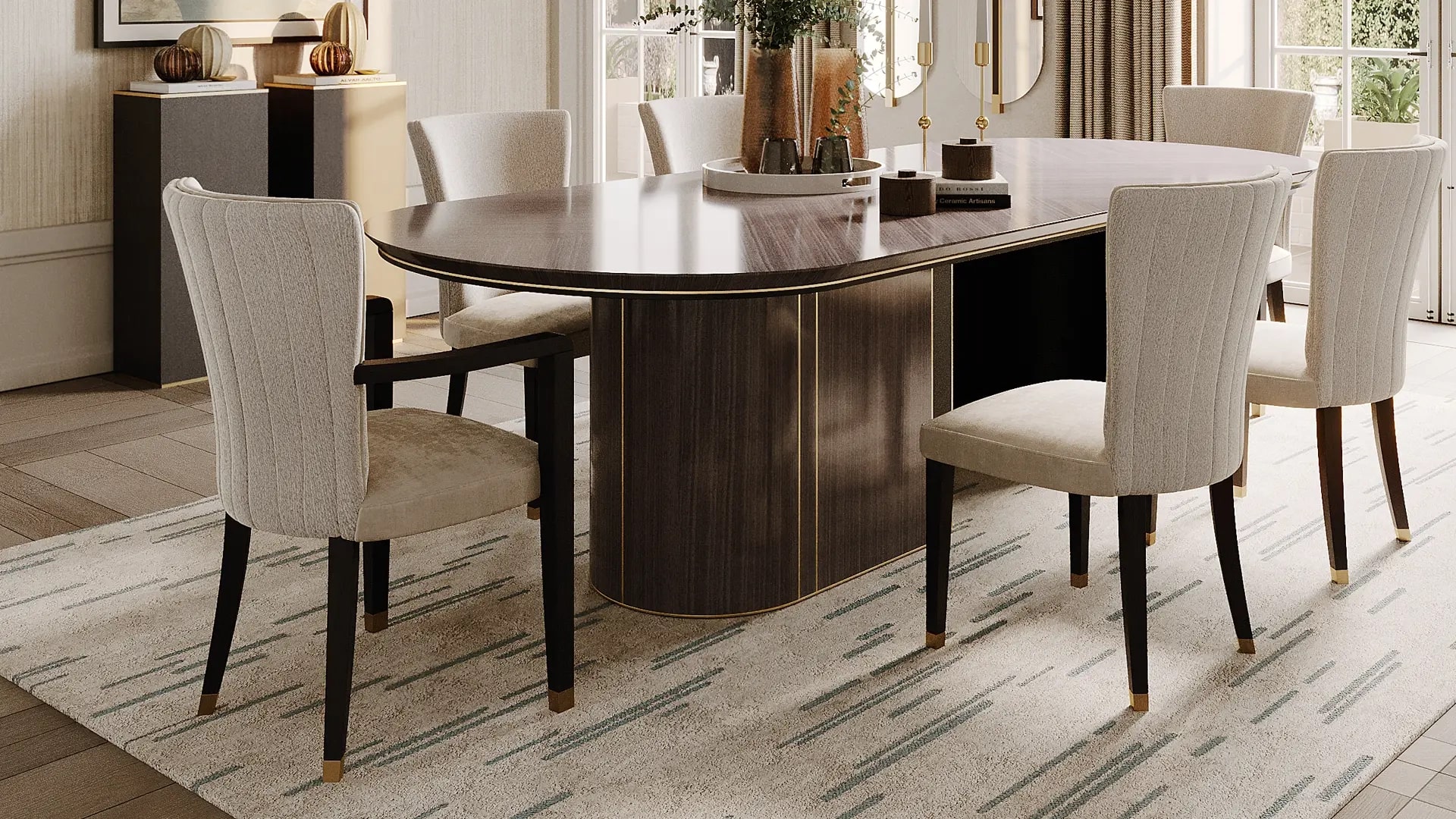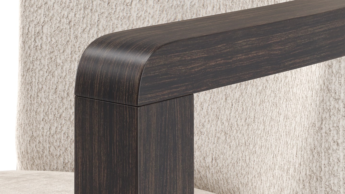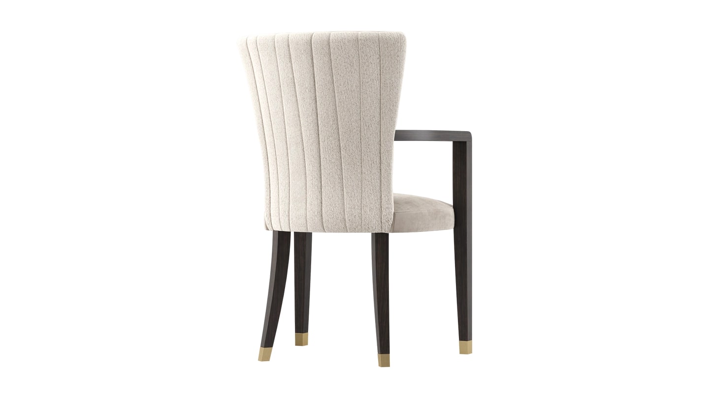 "Наше обеденное кресло BASTILLE с урезанной спинкой и уравновешенной посадкой выигрывает в стиле благодаря тонкому контрасту между гладким бархатным сиденьем и более текстурированной тканевой спинкой, которая дополнительно усиливается изящными линейными деталями сзади".