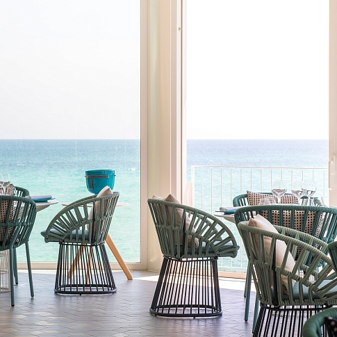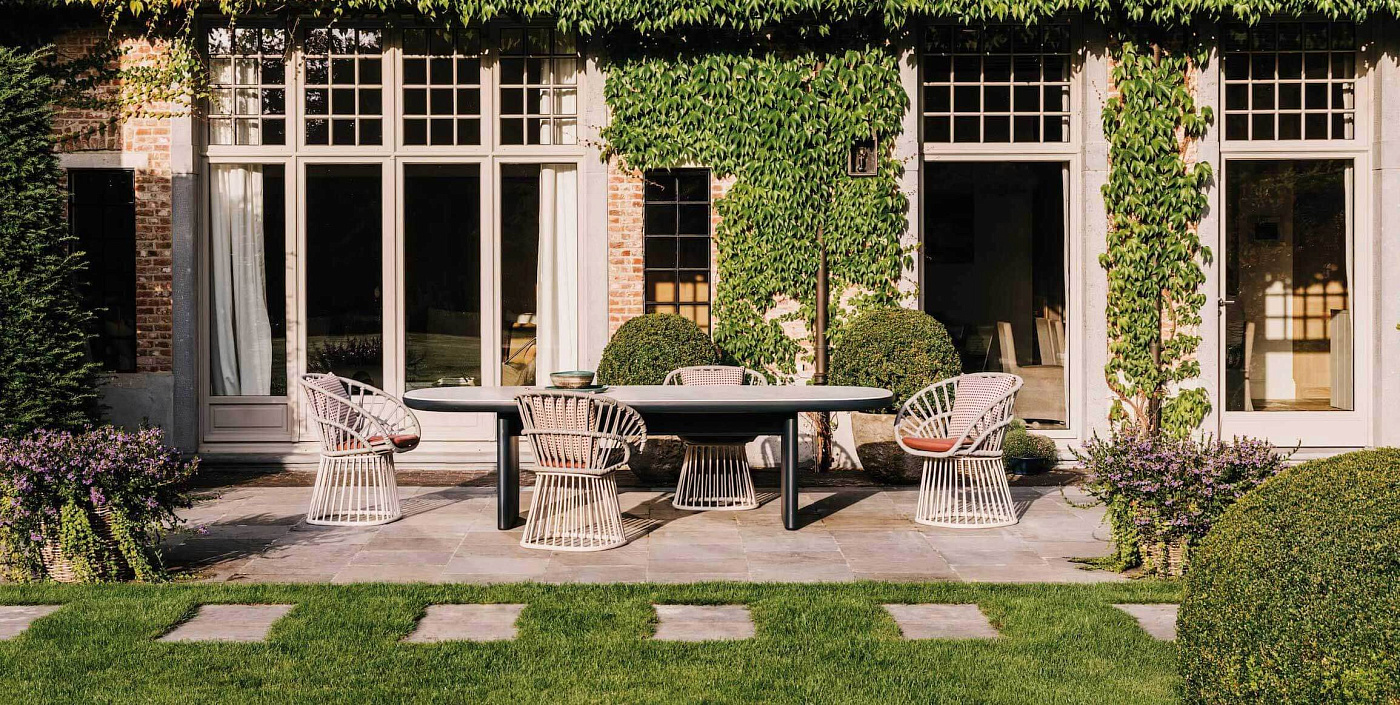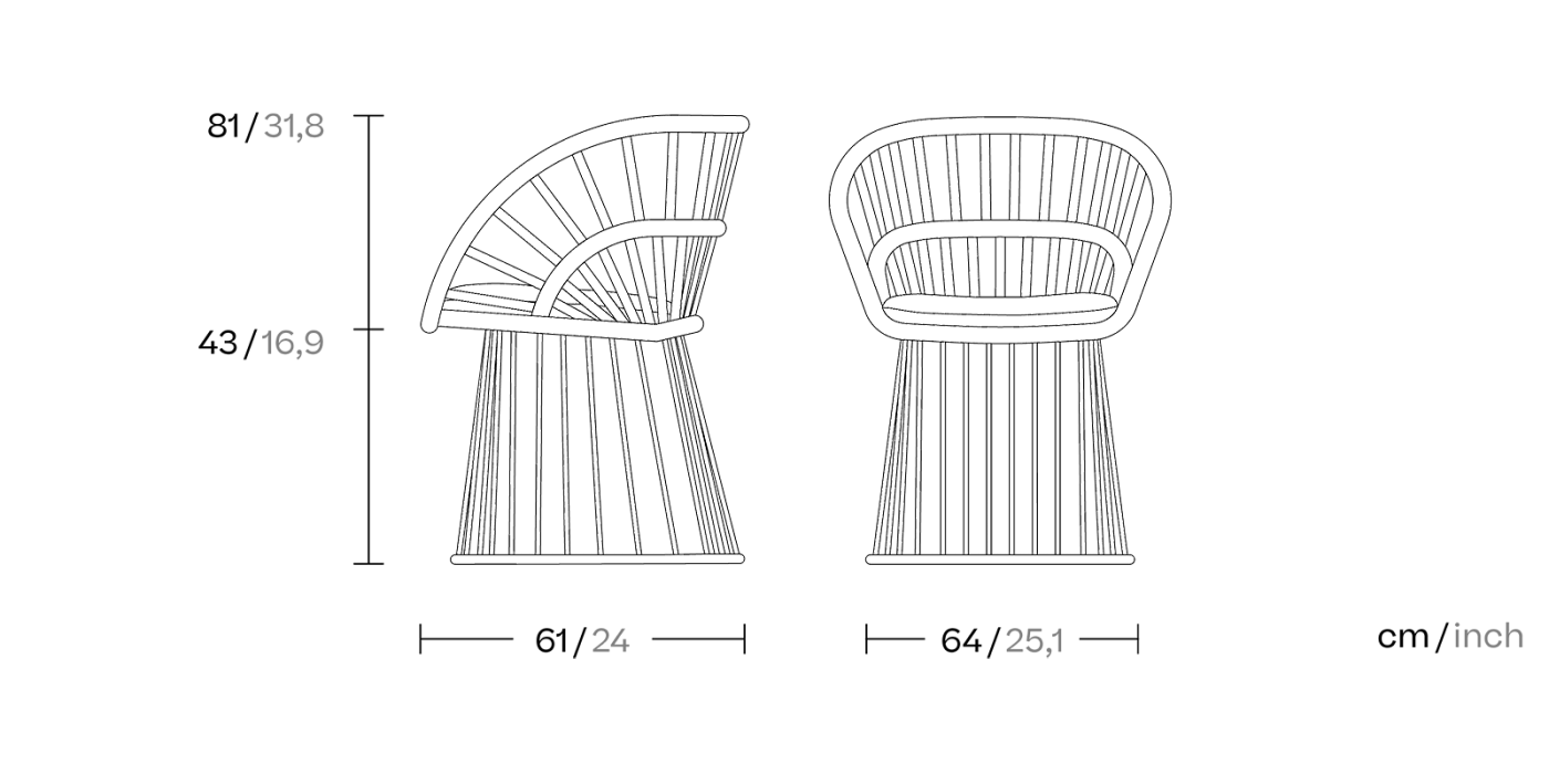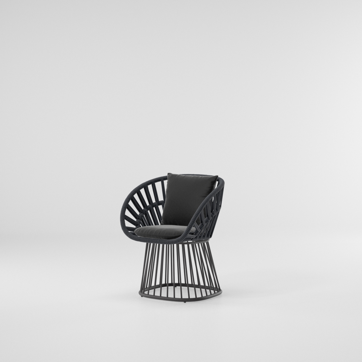 Cala’ - это кресло с высокой спинкой, вдохновленное культовым Эммануэль. Кресло обладает величественным пространственным присутствием благодаря прозрачным и светлым поверхностям. Открытое переплетение веревки создает решетчатое окно для визуальной приватности, сохраняя при этом связь с природными элементами. "Кала" может использоваться как для обедов на открытом воздухе, так и в качестве кресла для отдыха . Широкий выбор металлических покрытий, цветов канатов и тканей для подушек открывает множество возможностей для придания индивидуальности креслу в соответствии с различными проектами. Каркас сиденья Cala изготовлен из алюминиевых профилей с покрытием. Плетение представляет собой завязанную узлом веревку. Стул поставляется с двумя вариантами ножек из тикового дерева или алюминиевой подставкой-основанием. Коллекция Cala включает в себя обеденный стул, серию столов, низкие скамеечки для ног, двух- и трехместный диван. Обеденный стол имеет монолитный и смелый вид, создавая контраст с легкостью стульев. Такую же каркасную конструкцию можно распознать в низких столиках и скамеечках для ног.