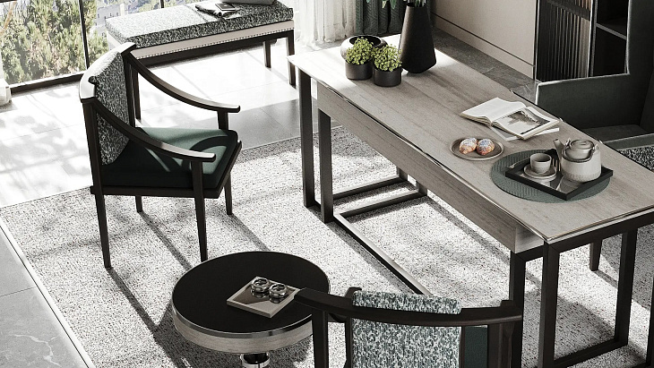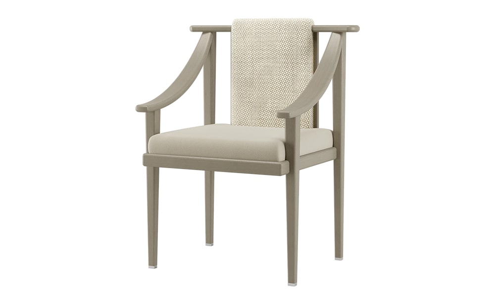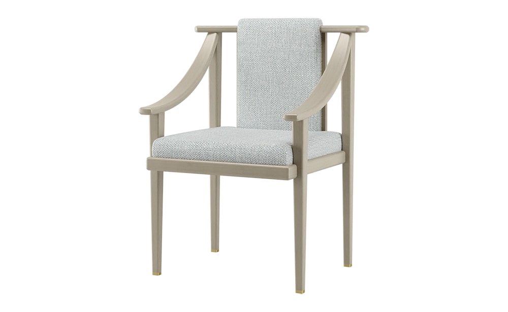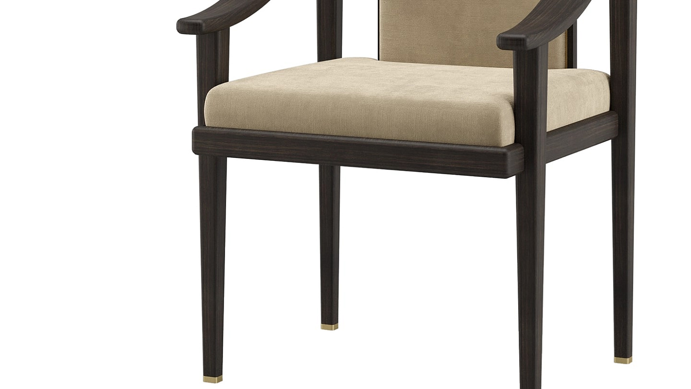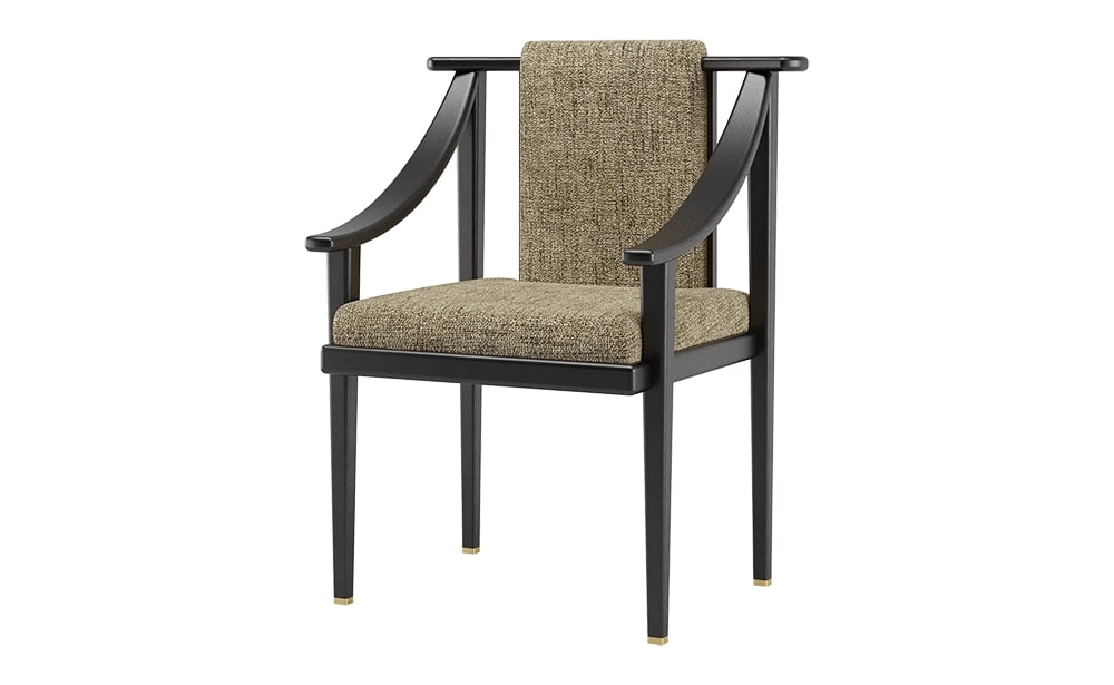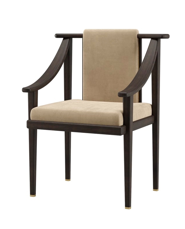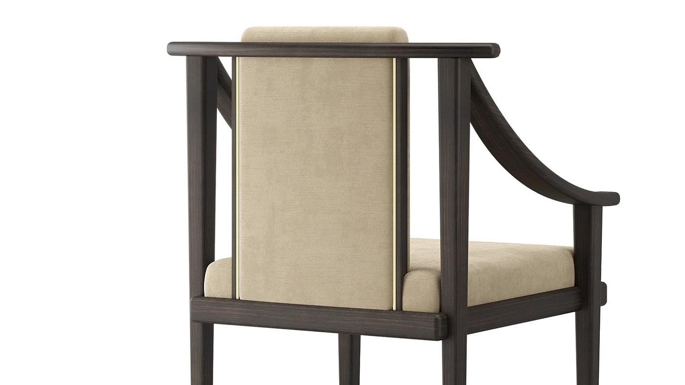 Палитра материалов с урезанной спинкой позволяет акцентировать внимание на выдающейся конструкции обеденного кресла KOCHI, которое черпает вдохновение в эстетике Дальнего Востока. Выполненный из темного массива дерева, бархатной обивки и деталей из матовой латуни, KOCHI сочетает в себе традиционное мастерство и дальновидную изысканность.