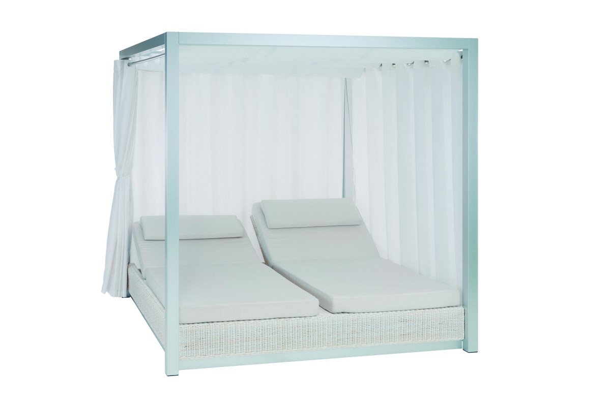 С балдахином для неспешного сна или без него для романтического заката… Sunset - это шезлонг, которым можно поделиться. Его легкий навес не только создает тень, но и позволяет нам почувствовать себя главными героями современной сказки. Его прочная и прочная конструкция сделана из анодированного алюминия, а кровать сделана из синтетического волокна Shintotex® компании POINT с ручным плетением.