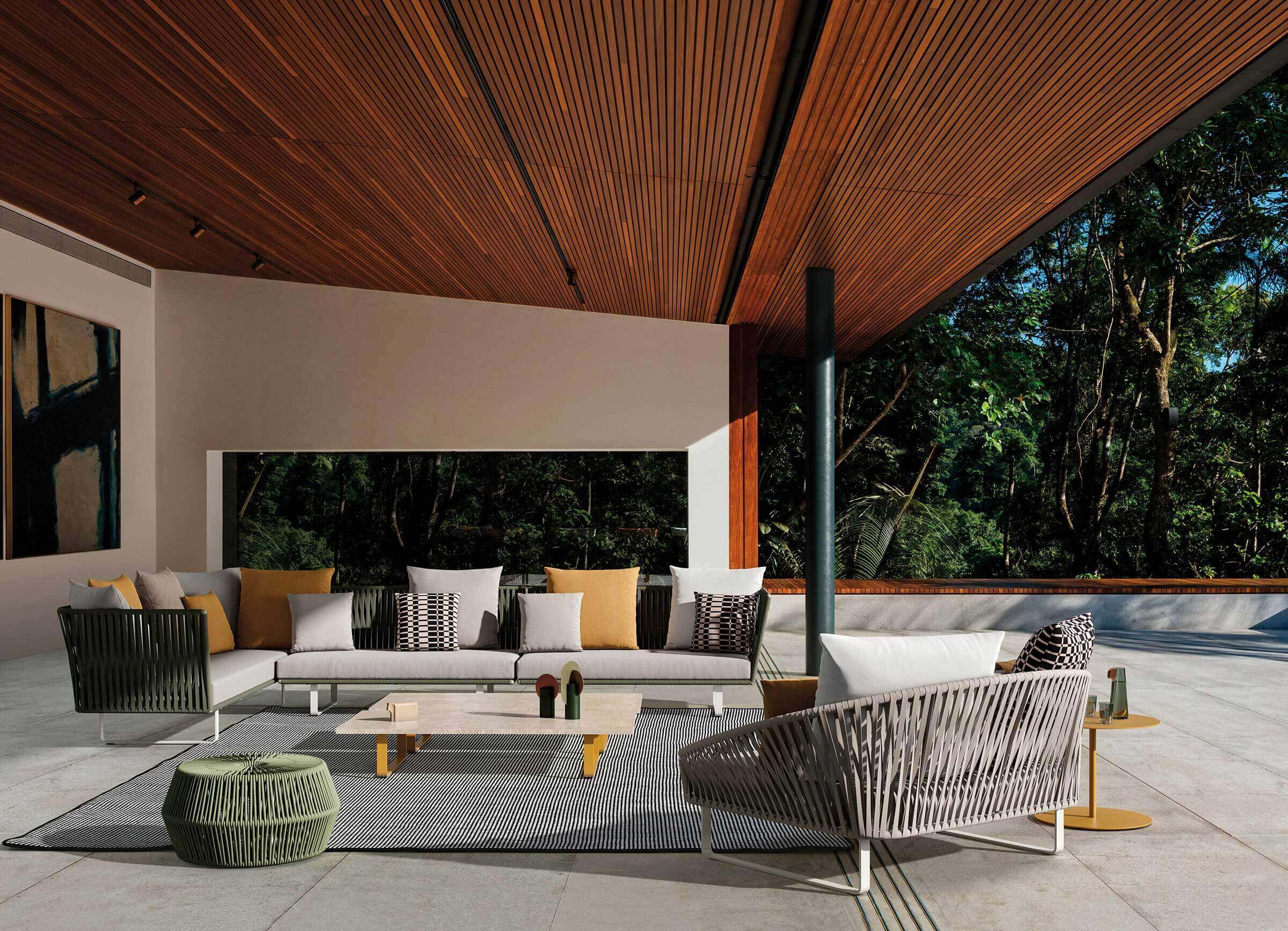 Для Kettal Bitta характерно сочетание алюминиевых и тиковых рам, сидений из плетеного полиэстера и удобных подушек, столешниц из тикового дерева или камня - и все это с использованием всех водонепроницаемых материалов. “Намерение дизайнера состояло в том, чтобы создать плотную оплетку, которая все еще пропускала бы воздух, напоминающую оплетку канатов, используемых для швартовки лодок (отсюда и название Bitta, что в переводе с итальянского означает "швартовка"), благодаря чему изделия выглядят легкими, но в то же время они выглядят прямо как уютные гнездышки в естественных тонах, в которых можно посидеть и расслабиться.”