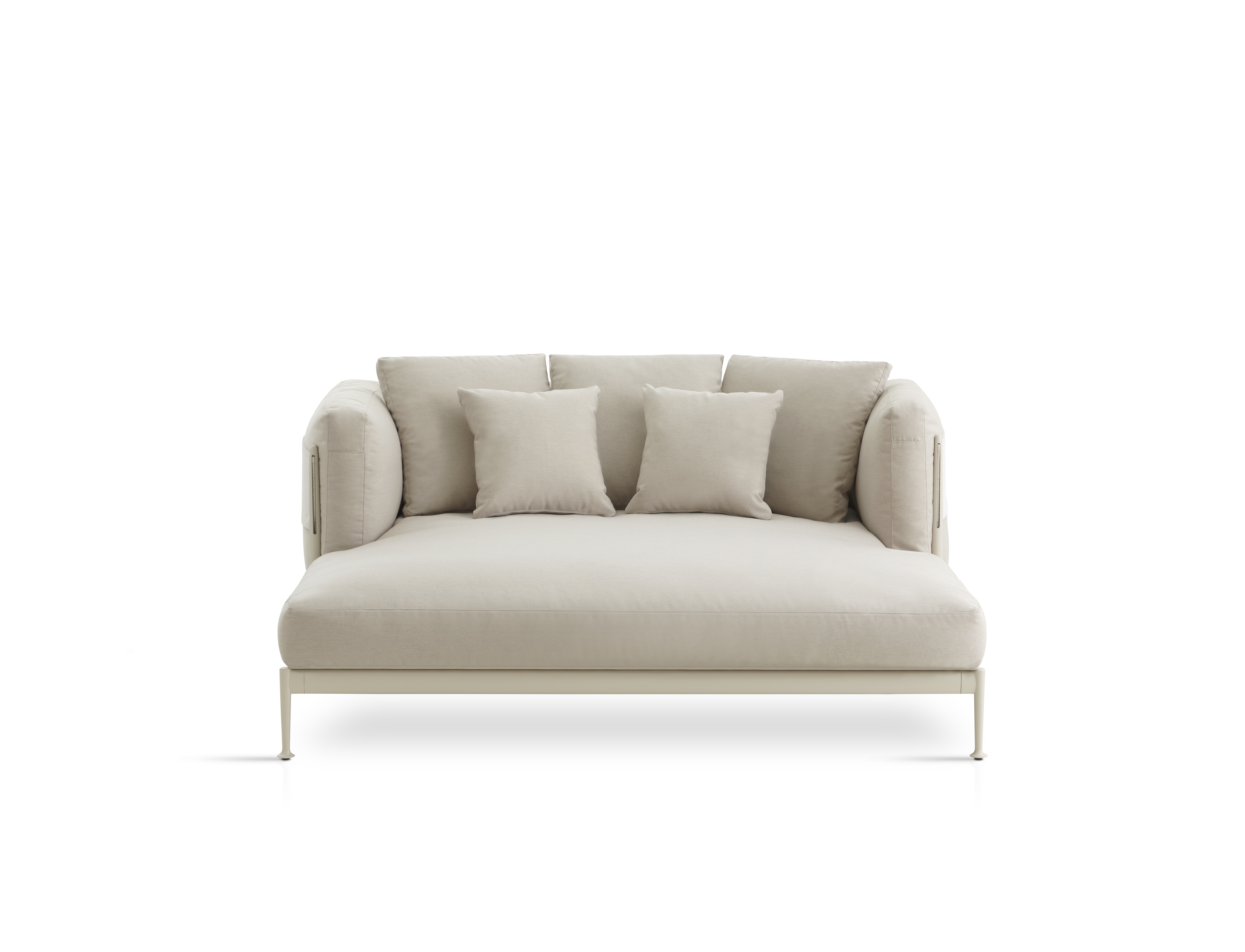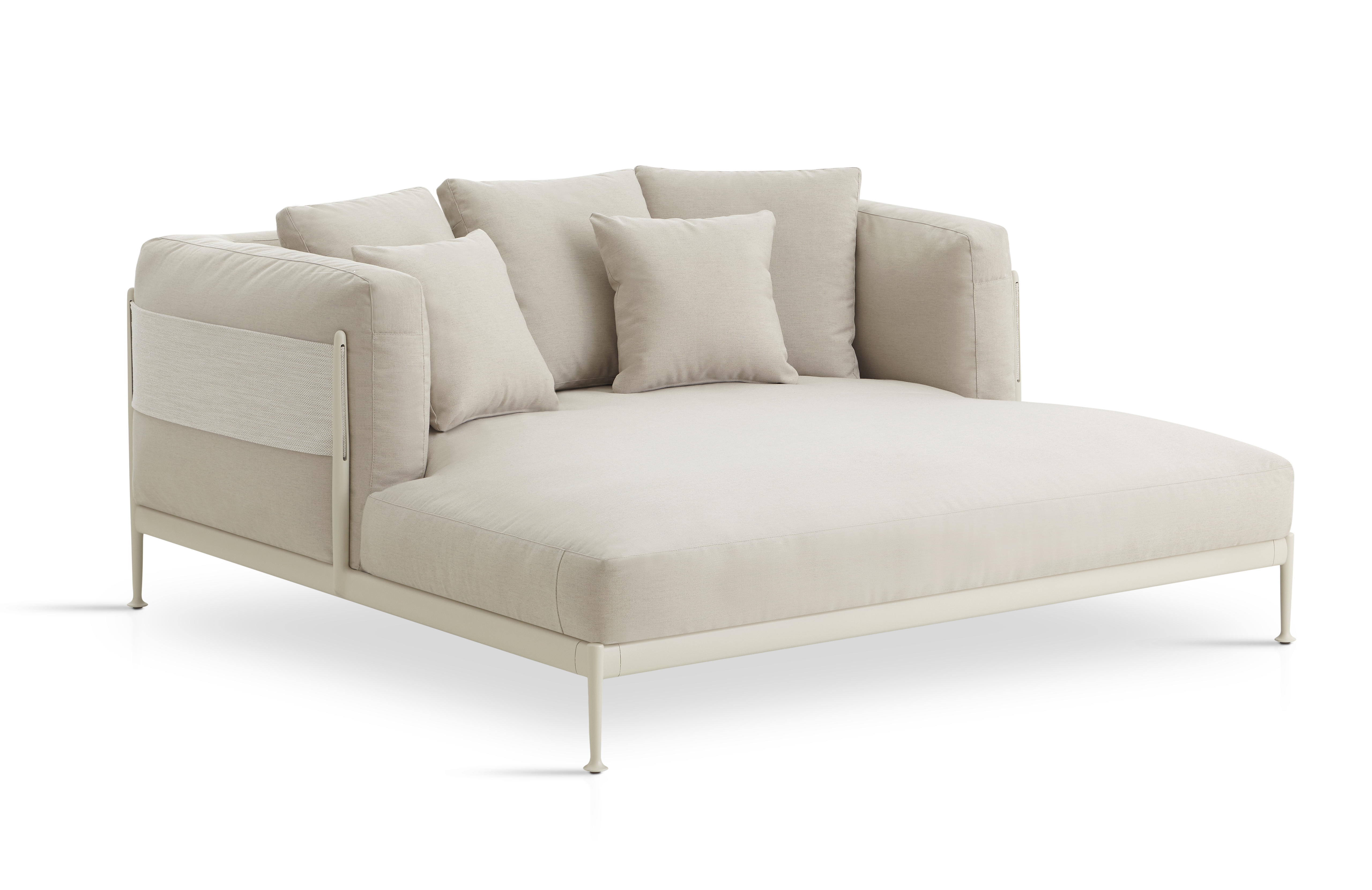 Кушетка со структурой из высокопрочного алюминиевого профиля и ножками из литого алюминия, покрытыми полиэфирной пудрой. Ремень из технической ткани Zander или Premium Sunbrella Sling. Возможность персонализации благодаря широкому выбору технических тканей, полностью подходящих для использования на открытом воздухе. Съемный мягкий чехол.