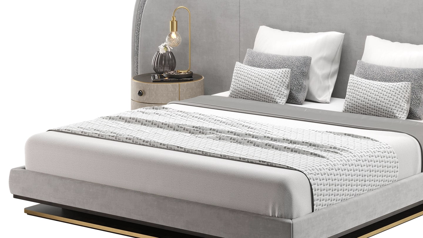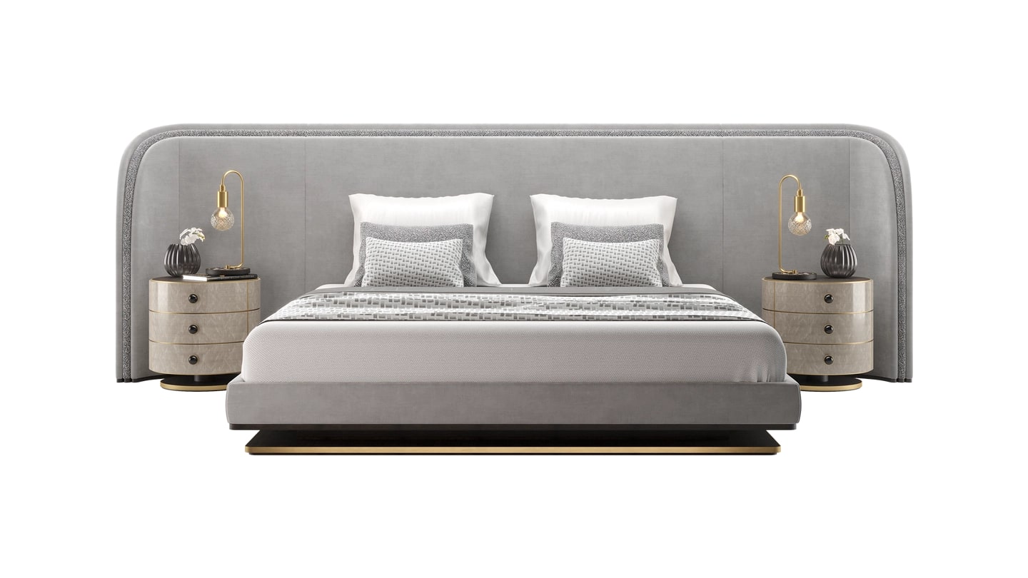 Шикарная кровать CALABRIA обыгрывает концепцию комнаты в комнате, театрально выделяя пространство для сна благодаря огромному мягкому изголовью, которое достаточно велико, чтобы вместить не только низкоуровневую кровать-платформу, но и две прикроватные тумбочки.