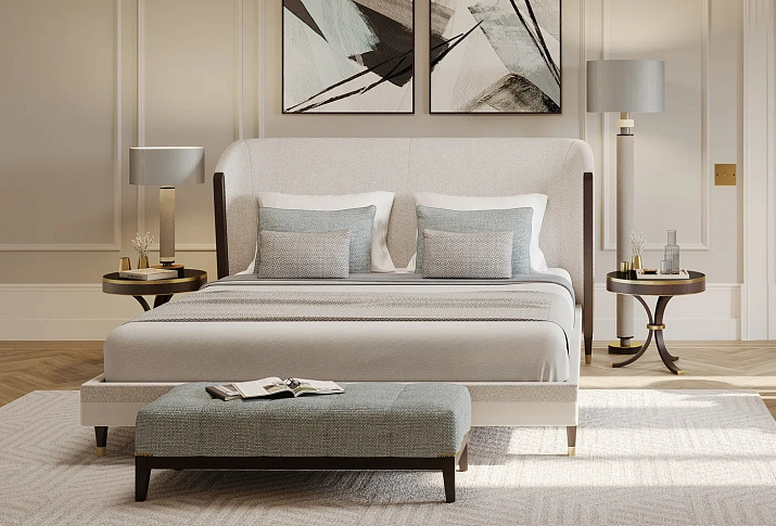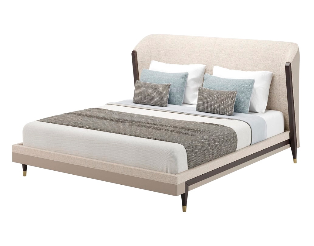 Кровать CARMEL, полностью обитая тканью на основе хлопка, в форме кокона способствует отдыху и релаксации благодаря мягко изогнутому изголовью и линейным деталям из шпона экзотического дерева, в то время как привлекательные металлические акценты придают изюминку ножкам.