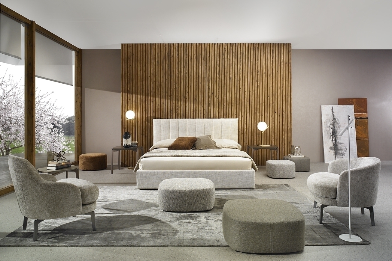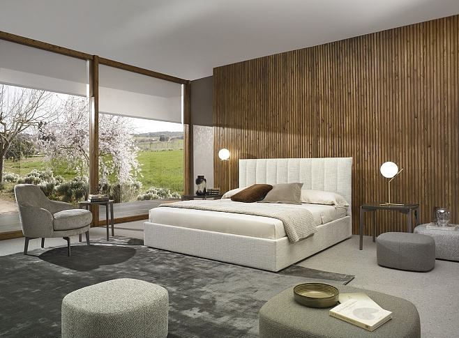 Dalia - это стилизованная кровать, тонкая и стильная, с вертикальными линиями, обозначающими волнистую обивку изголовья и подчеркивающими чувственный комфорт. Мастерство во всей красе проявляется в тщательной проработке деталей отделки изголовья, классической, элегантной и современной. Преимущества узкого изголовья и каркасного обрамления очевидны в условиях ограниченного пространства. Доступны различные размеры для адаптации ко всем матрасам, включая внутреннюю систему регулировки высоты и прикроватный столик.