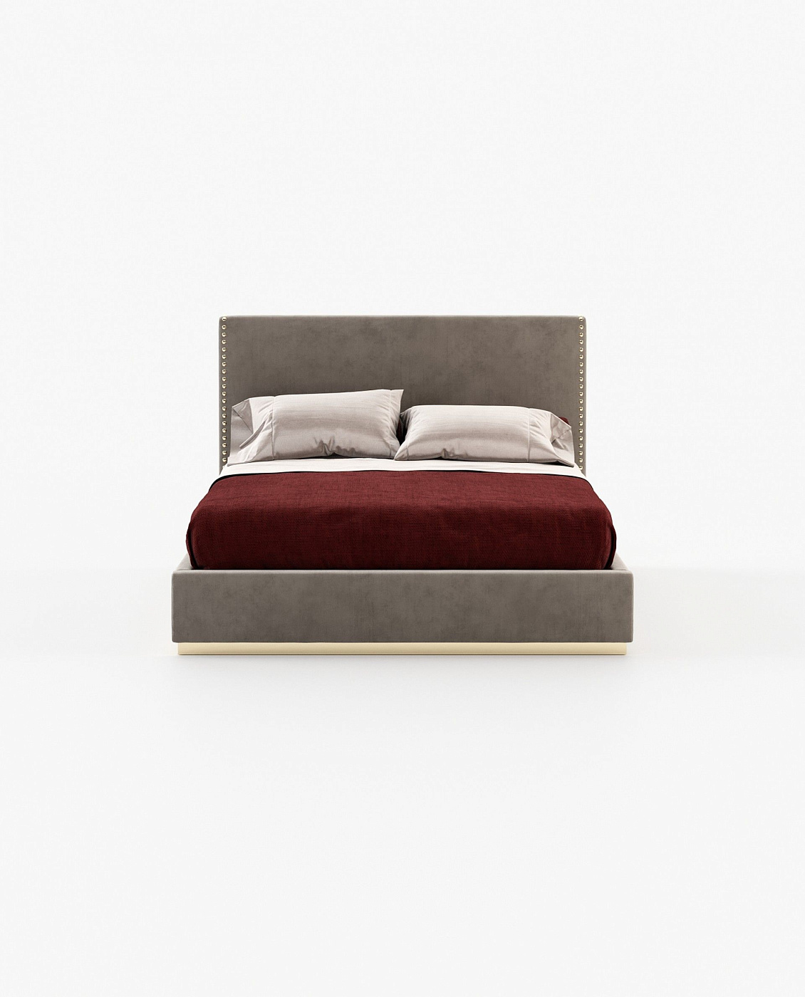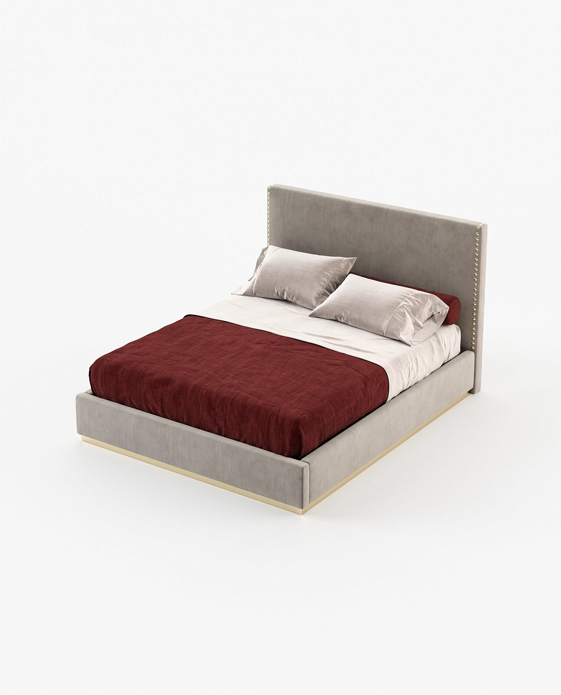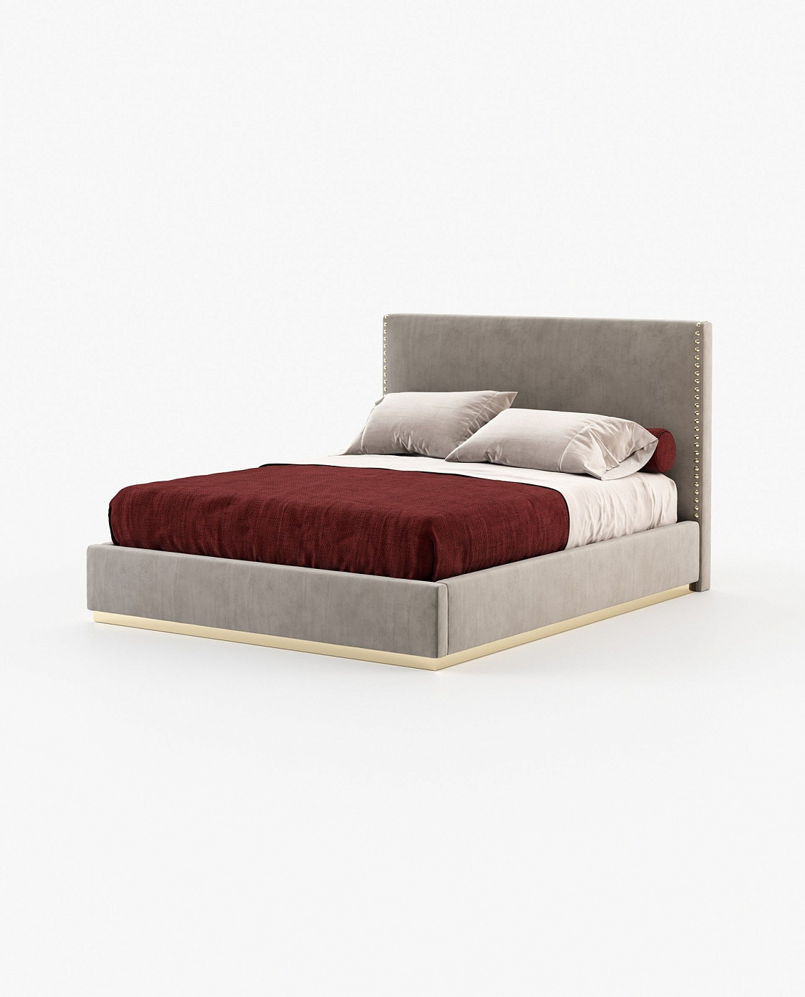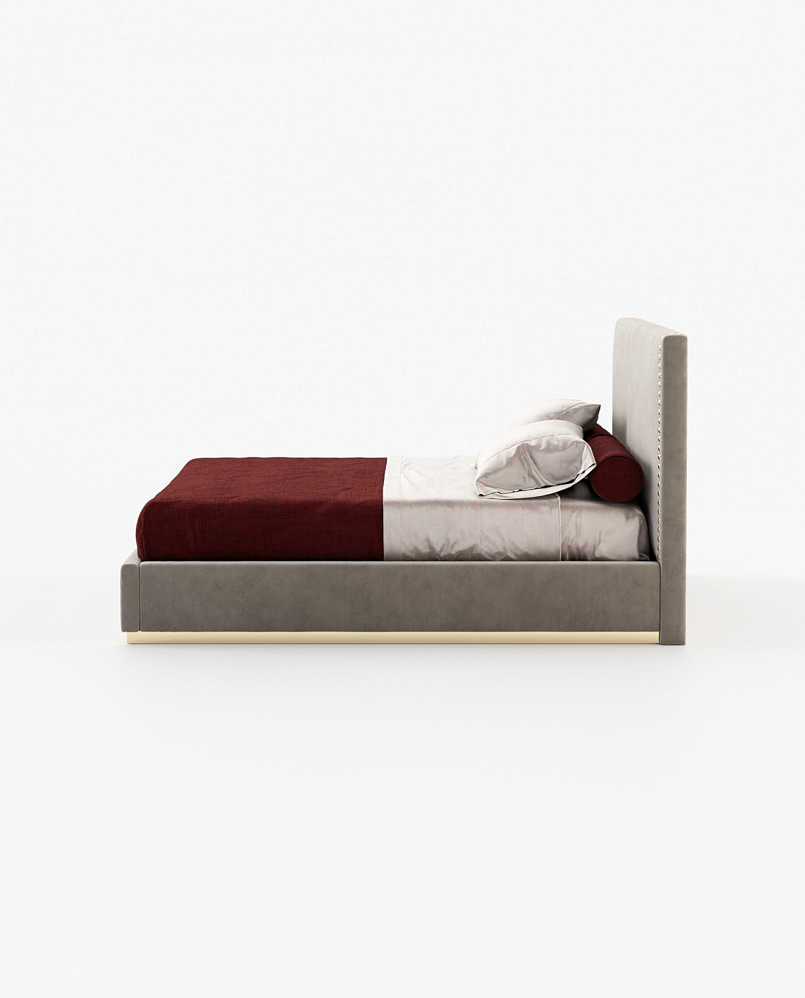 Мягкая кровать Marlin с высоким изголовьем и низкопрофильной основой, поддерживаемая металлическим бордюром. Элегантная и современная кровать, которая сочетает в себе металлическую структуру, золотые детали и изысканные ткани.
