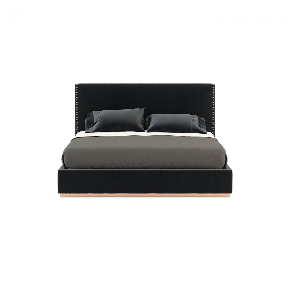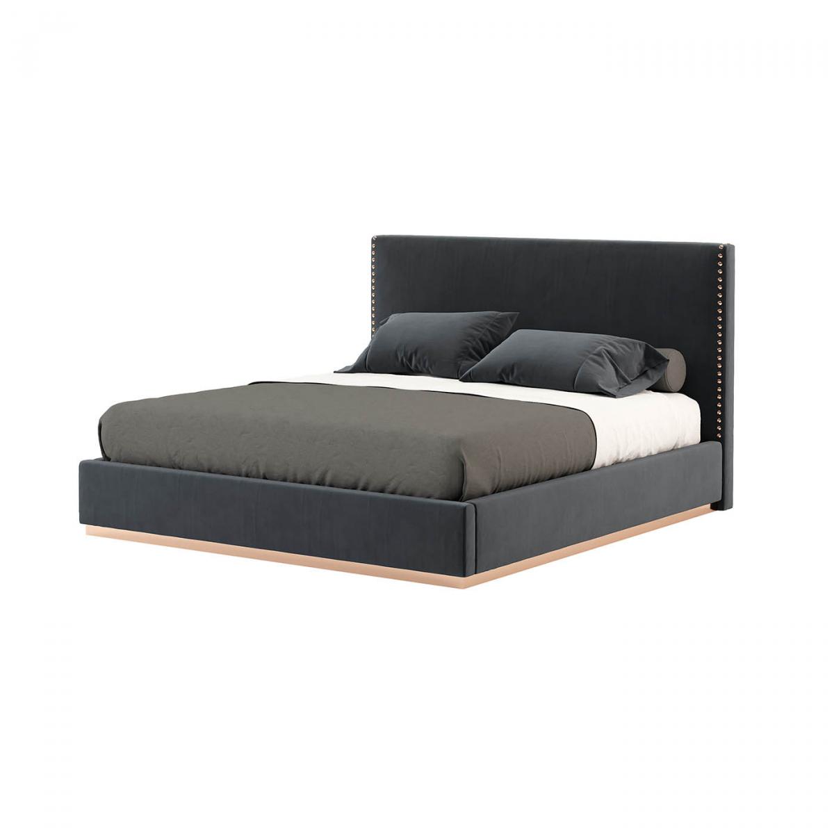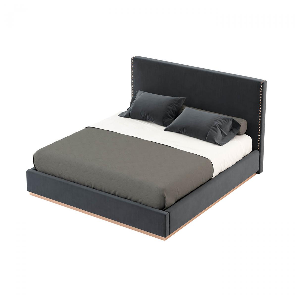 Мягкая кровать Marlin с высоким изголовьем и низкопрофильной основой, поддерживаемая металлическим бордюром. Элегантная и современная кровать, которая сочетает в себе металлическую структуру, золотые детали и изысканные ткани.