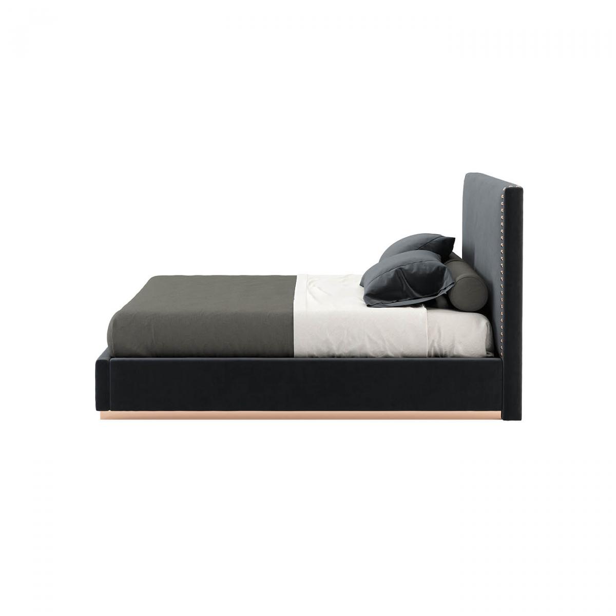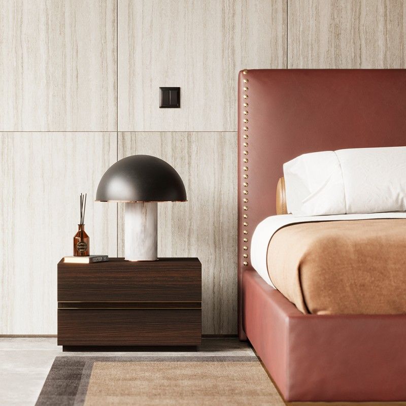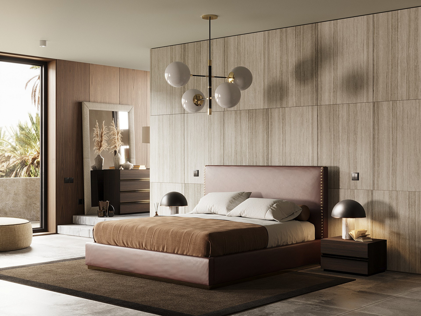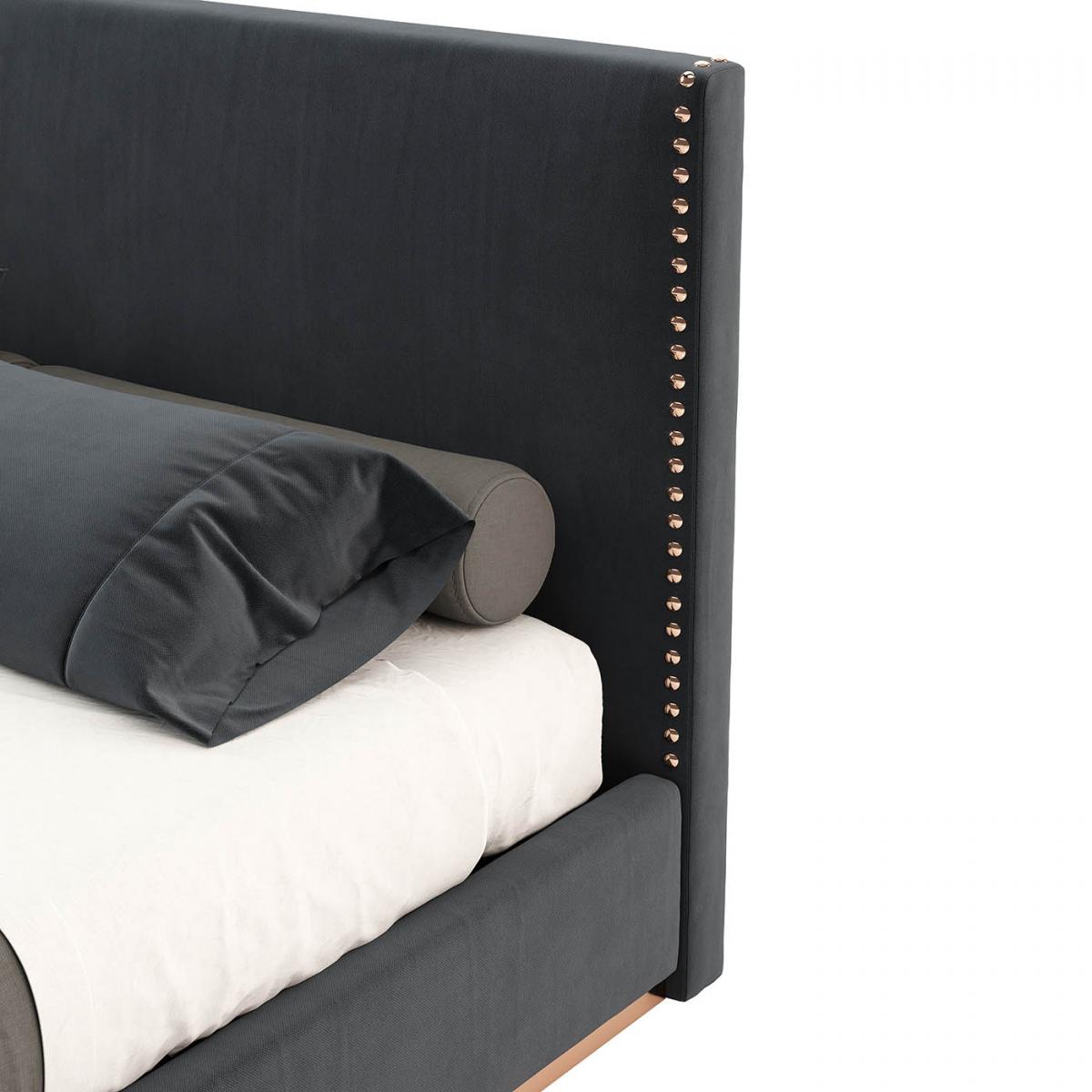 Мягкая кровать Marlin с высоким изголовьем и низкопрофильной основой, поддерживаемая металлическим бордюром. Элегантная и современная кровать, которая сочетает в себе металлическую структуру, золотые детали и изысканные ткани.
