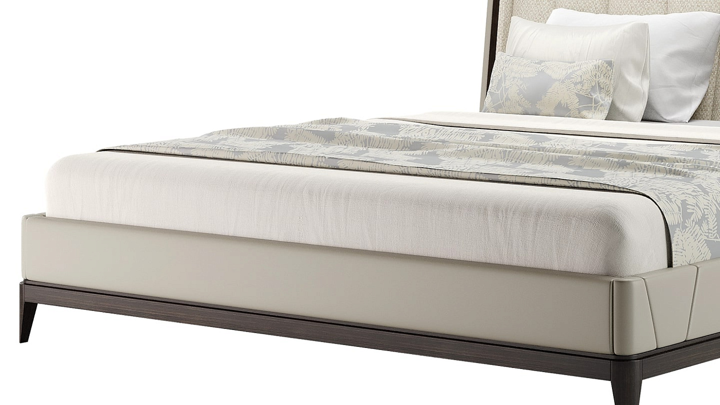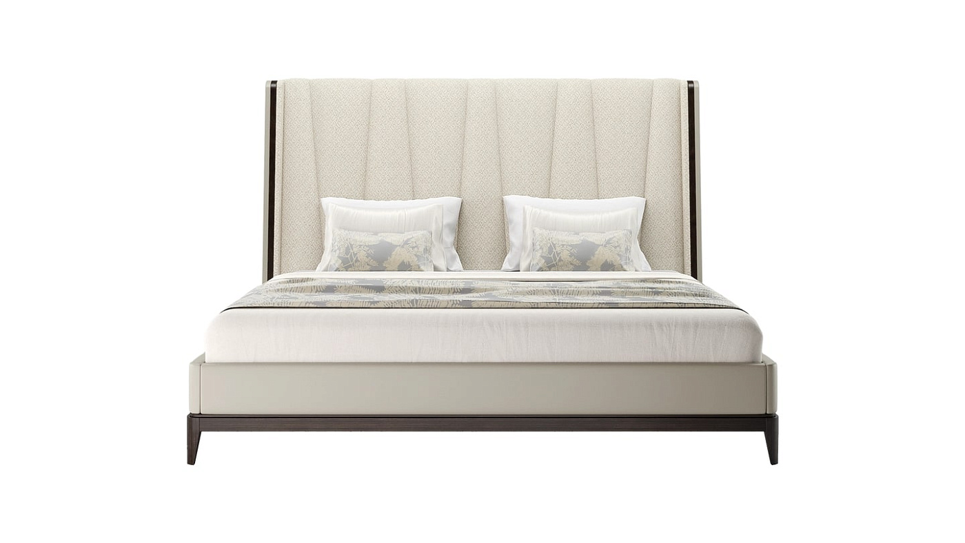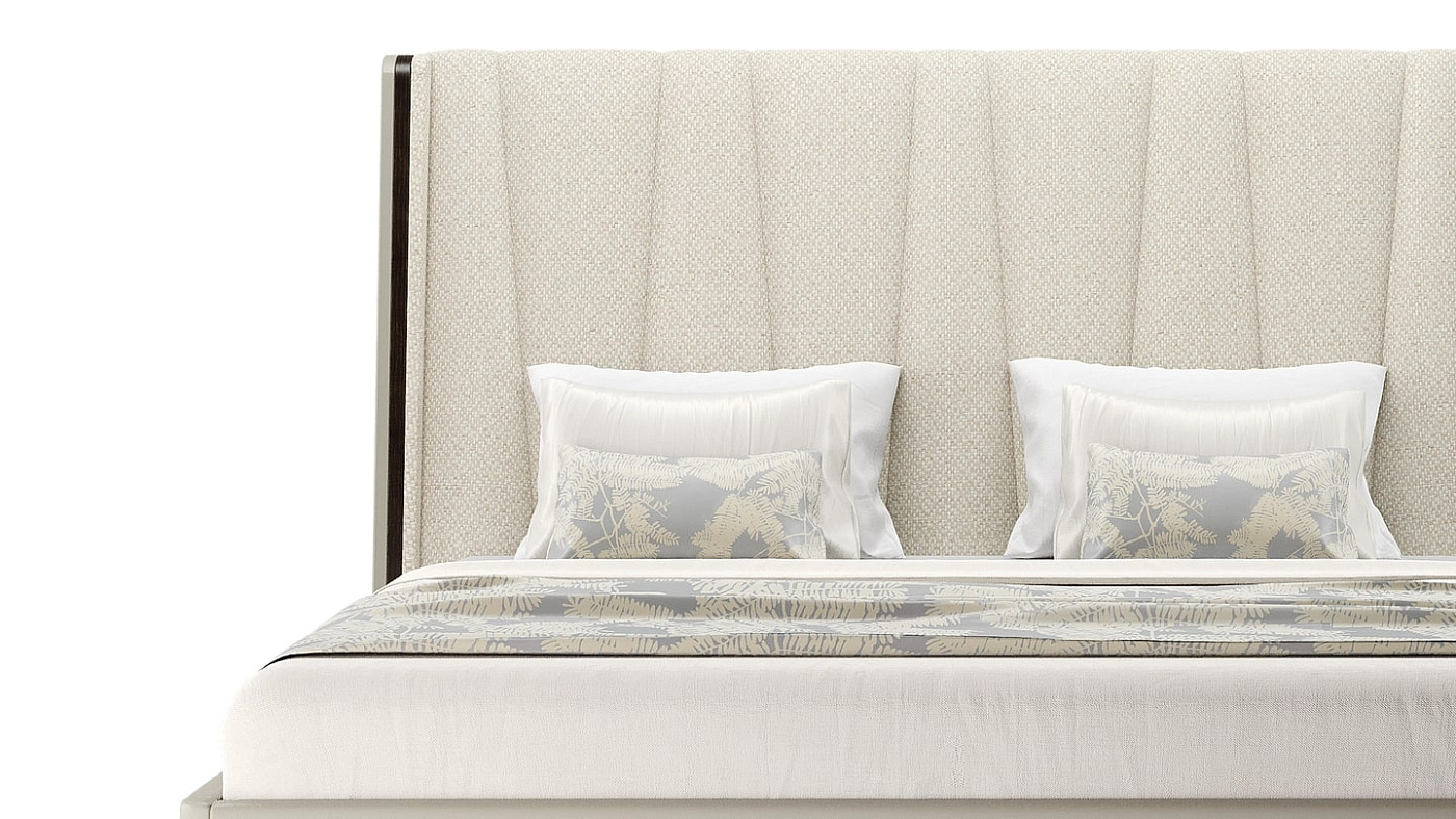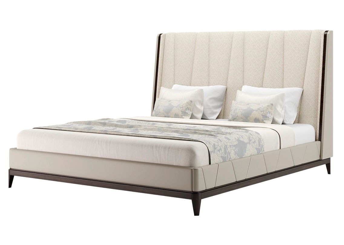 Крупногабаритное изголовье с мягкой обивкой, выполненное в виде изящного V-образного узора, придает элегантной кровати NANTES выразительный вид. Он заключен в кремовую обивку из кожи, которая расположена на простом четырехногом основании из контрастного шпона темного дерева.