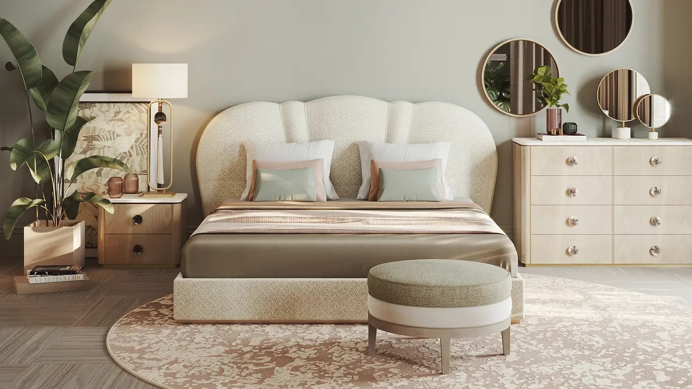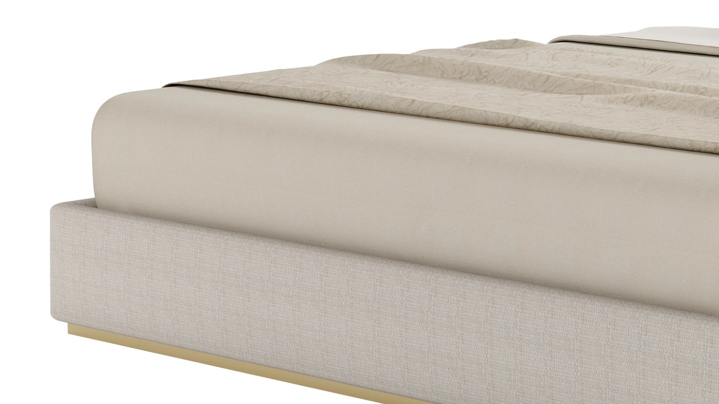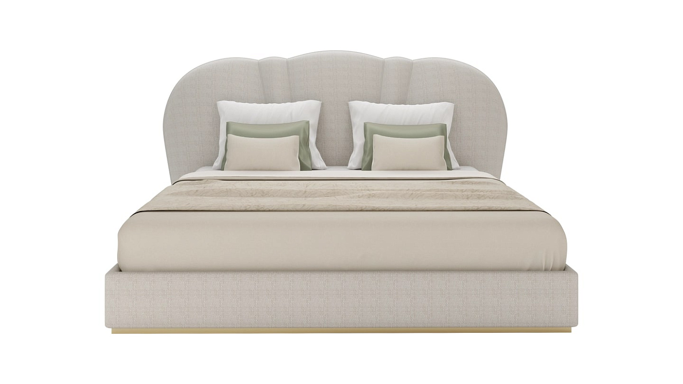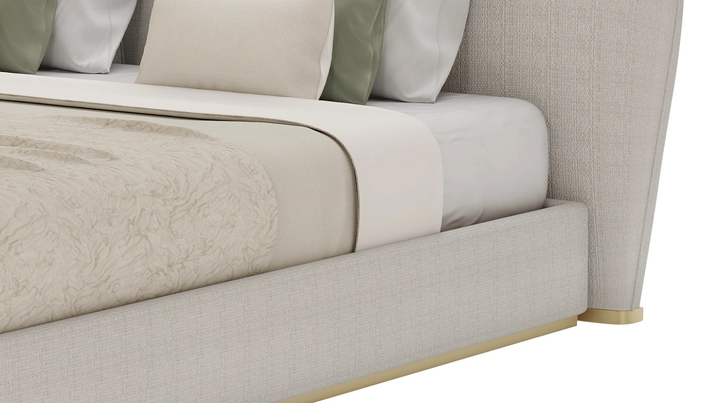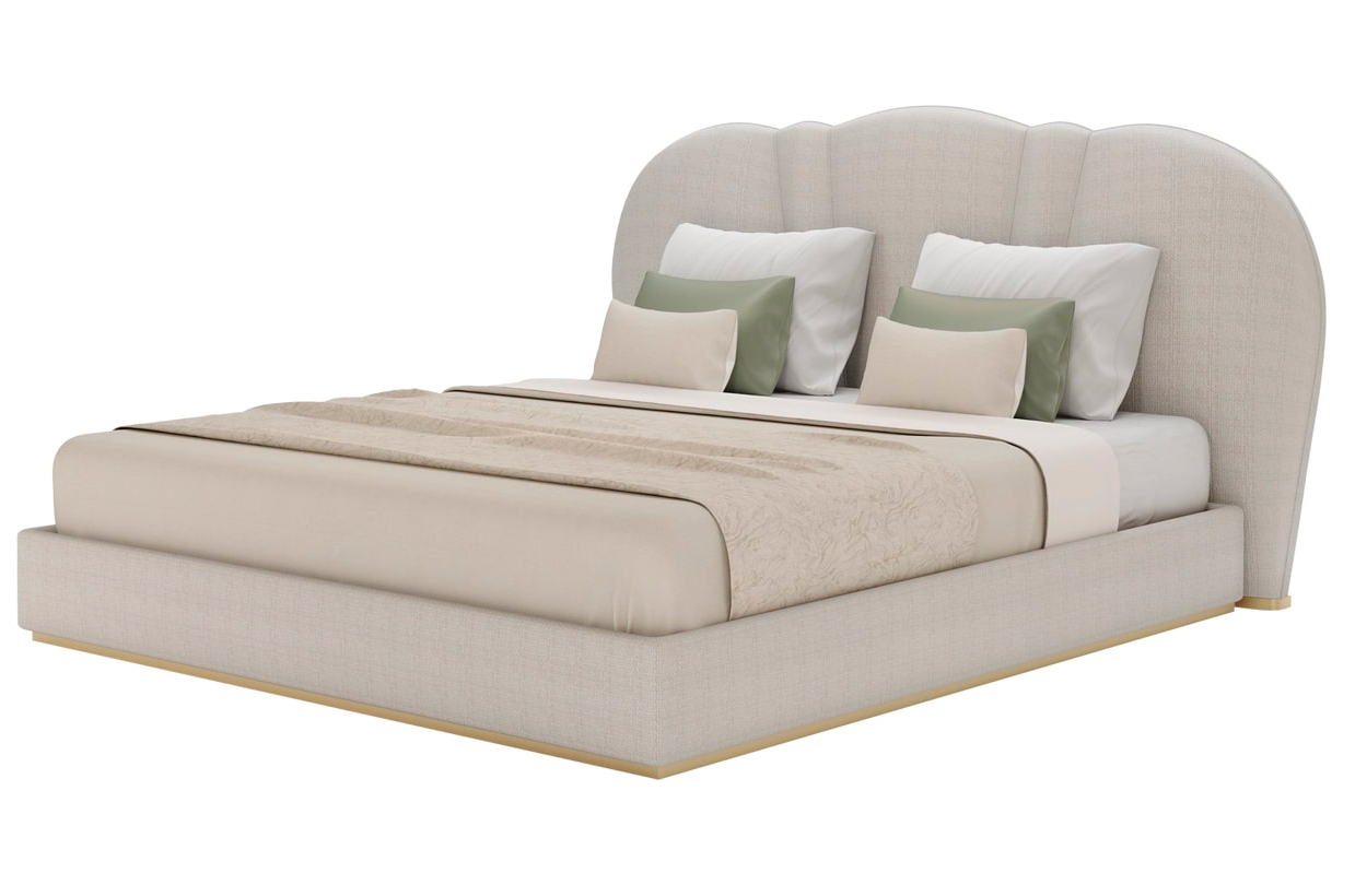 "Чистые линии и плавные изгибы сочетаются в этой роскошной кровати SAMARA, которая опирается на стиль ар-деко, чтобы придать своему яркому дизайну вневременное качество. Обитая тканью спокойного натурального оттенка, кровать установлена на матовом латунном основании, излучающем тепло и роскошь. "