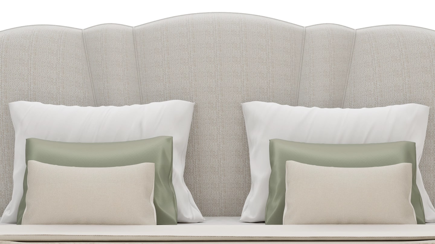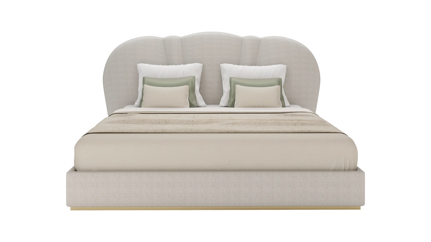 "Чистые линии и плавные изгибы сочетаются в этой роскошной кровати SAMARA, которая опирается на стиль ар-деко, чтобы придать своему яркому дизайну вневременное качество. Обитая тканью спокойного натурального оттенка, кровать установлена на матовом латунном основании, излучающем тепло и роскошь. "