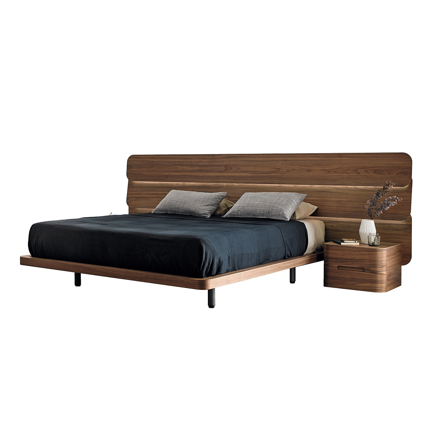 Горизонтальный дизайн кровати Dodó создает ощущение тишины и покоя. Изголовье состоит из различных горизонтальных планок, которые перекрывают друг друга по вертикали, имитируя крышу, убежище, место для укрытия. Эти горизонтальные линии дополняются плавно изогнутыми углами и гранями; графический ресурс, который объединяет все элементы коллекции, а также помогает создать приятное ощущение легкости, тепла и эргономики.