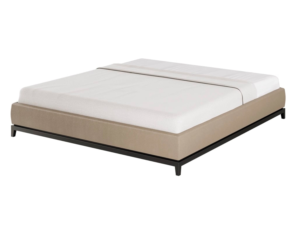 Кровать LAGOA с минималистичным дизайном имеет основание на четырех ножках, облицованное шпоном темного дерева, поверх которого расположена обтянутая кожей обивка, удерживающая матрас на месте. Оформите его просто или добавьте изголовье кровати по вашему выбору.
