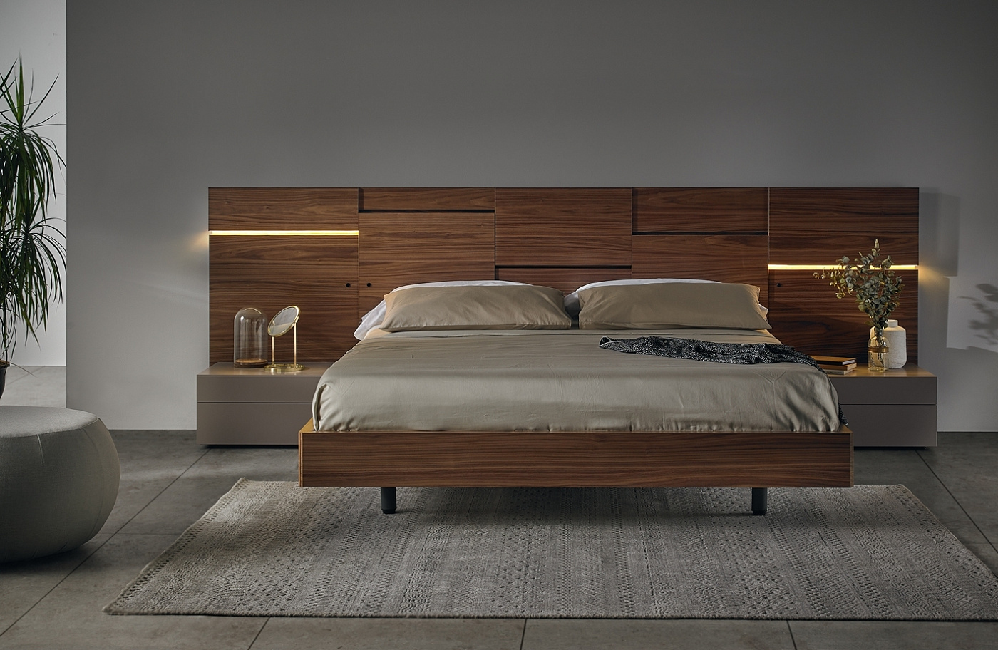 Liin — это упражнение в абстракции и динамизме. Части собраны на разной глубине, создавая сбалансированное асимметричное соединение и в то же время элегантно обрамляя кровать. Изголовье может включать горизонтальные светильники на разной высоте, подчеркивающие продольные линии конструкции. Освещение работает с датчиками, каждый независимо, добавляя этому элементу жизненной силы.