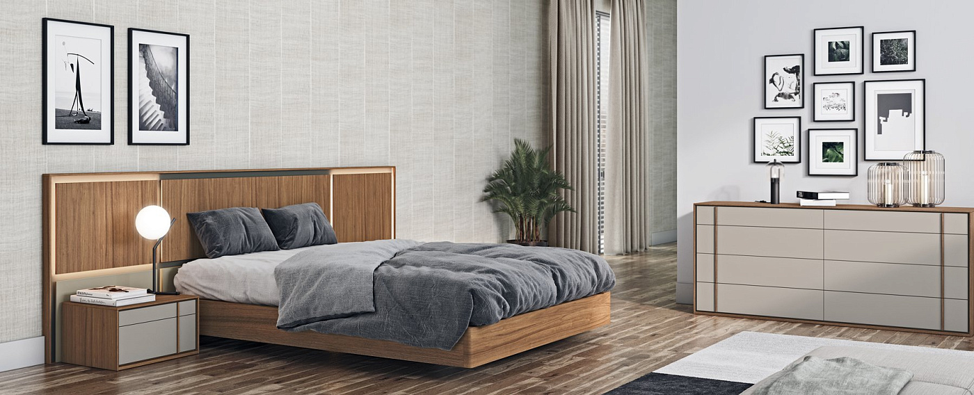 LIGHT спальня позволяет наложить текстуры всех материалов, доступных в каталоге EMEDE, на заднюю поверхность, обрамленную по периметру. Новинкой этой спальни является подсветка потолочных светильников, составляющих изголовье. Композиционная отделка: Канапе Лак Дюна