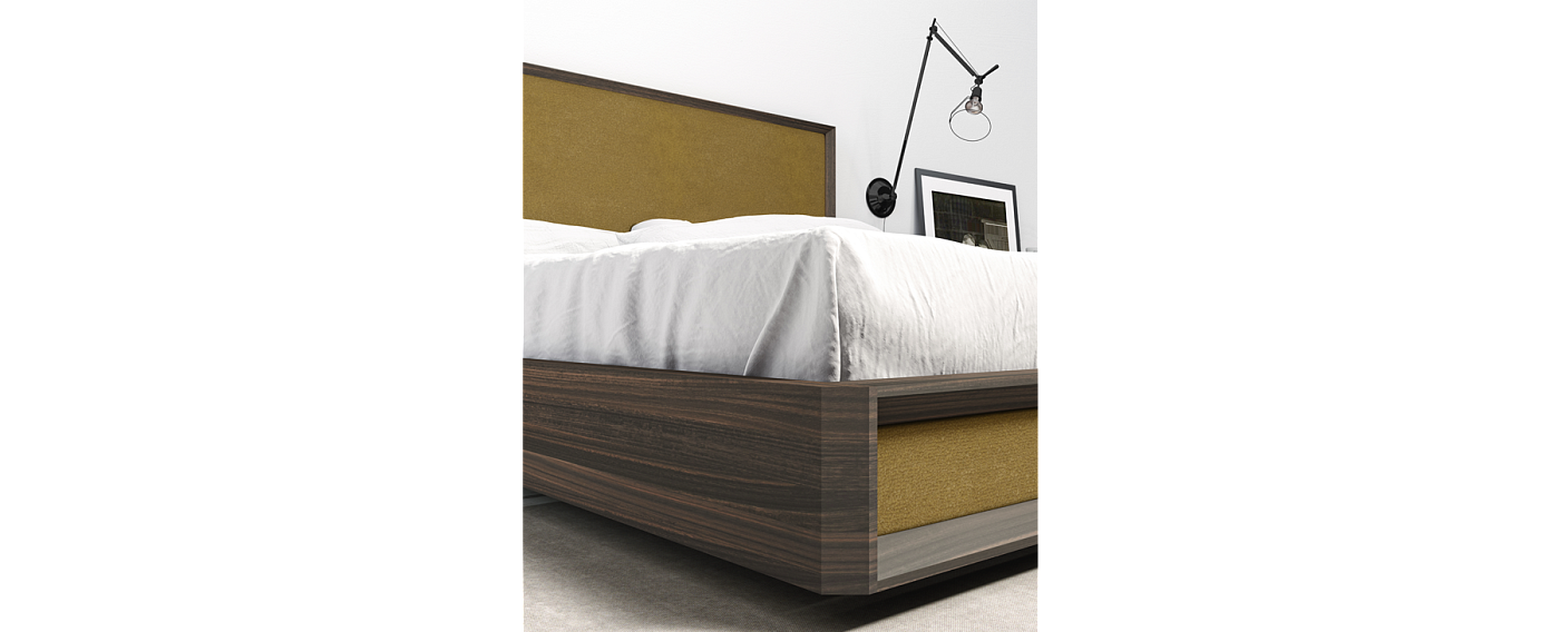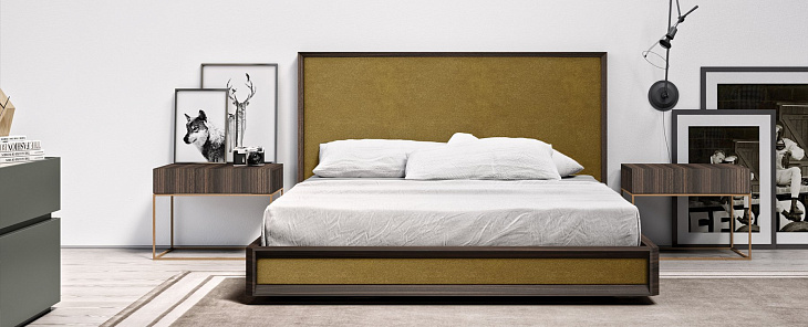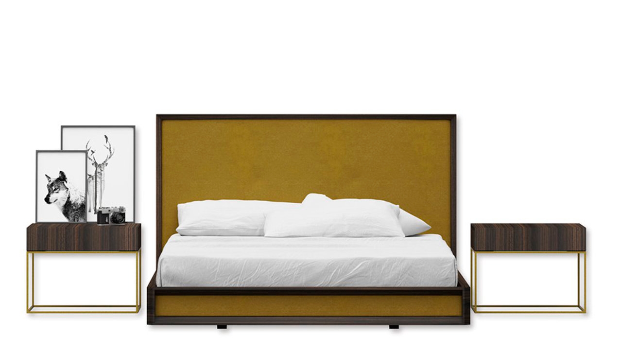 Кровать МАРКЕТ спроектирована с целью обеспечения комфортного и расслабляющего отдыха без ущерба для общего сбалансированного внешнего вида. Мягкие вставки сочетают мягкость, которая контрастирует со смелыми углами дерева. Отделка в показанном примере: Шпон Коала Обивка Царское золото Золотой металл