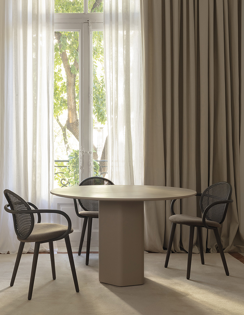 Круглый обеденный стол Talo для помещений Altherr Désile Park. 2023 Столешница и ножки из массива европейского дуба с сечением 21 мм/0,83 дюйма. Основание оснащено металлическим противовесом для обеспечения устойчивости стола. Коллекция также доступна в лакированной версии (МДФ) и в шпоне европейского дуба.