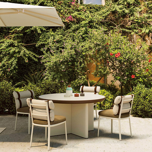 Cala’ - это кресло с высокой спинкой, вдохновленное культовым Эммануэль. Кресло обладает величественным пространственным присутствием благодаря прозрачным и светлым поверхностям. Открытое переплетение веревки создает решетчатое окно для визуальной приватности, сохраняя при этом связь с природными элементами. "Кала" может использоваться как для обедов на открытом воздухе, так и в качестве кресла для отдыха . Широкий выбор металлических покрытий, цветов канатов и тканей для подушек открывает множество возможностей для придания индивидуальности креслу в соответствии с различными проектами. Каркас сиденья Cala изготовлен из алюминиевых профилей с покрытием. Плетение представляет собой завязанную узлом веревку. Стул поставляется с двумя вариантами ножек из тикового дерева или алюминиевой подставкой-основанием. Коллекция Cala включает в себя обеденный стул, серию столов, низкие скамеечки для ног, двух- и трехместный диван. Обеденный стол имеет монолитный и смелый вид, создавая контраст с легкостью стульев. Такую же каркасную конструкцию можно распознать в низких столиках и скамеечках для ног.