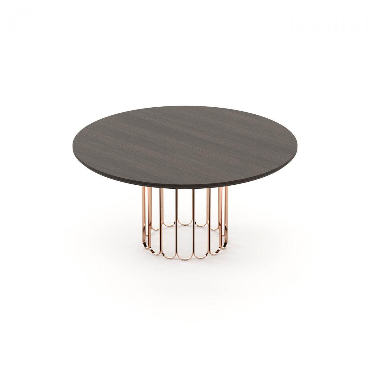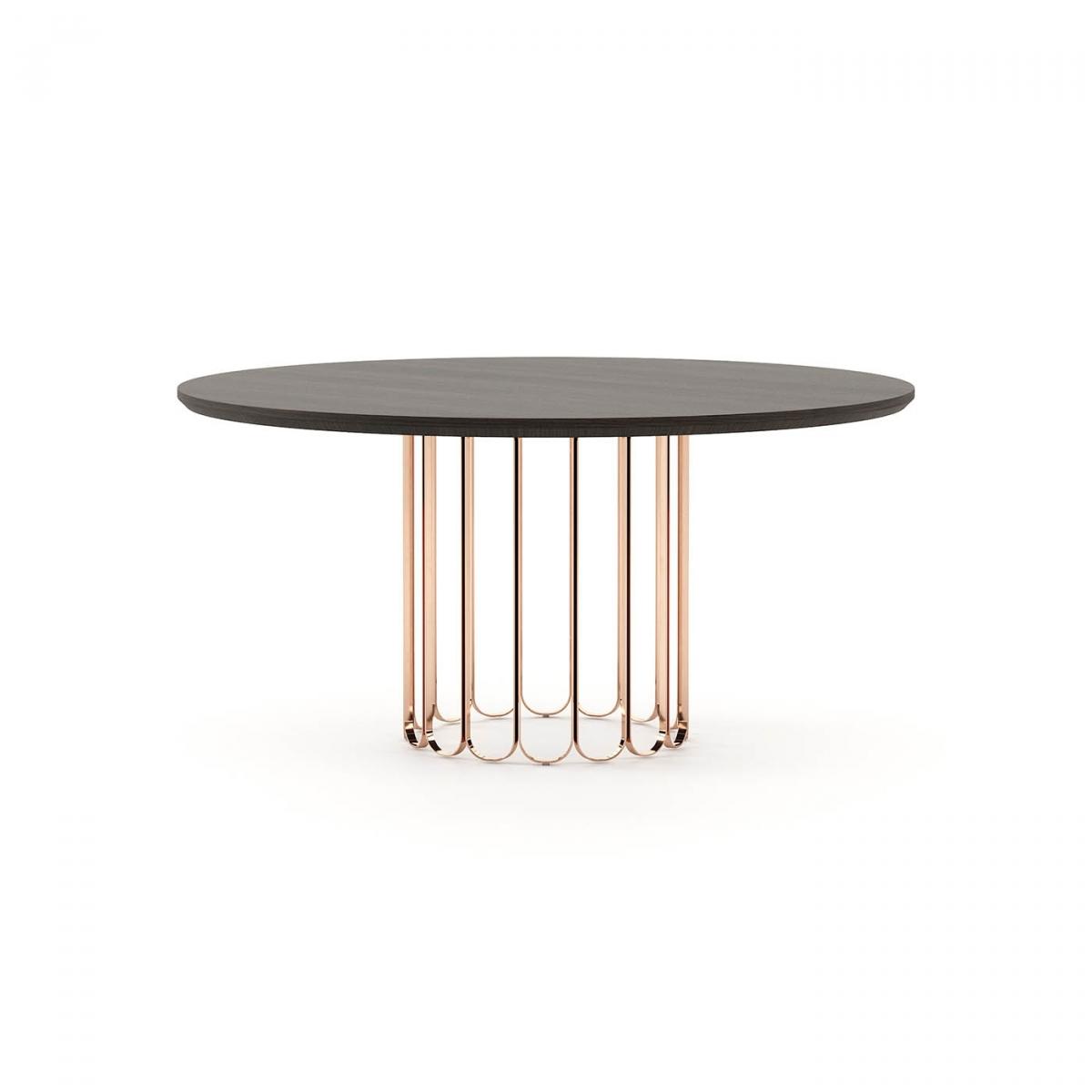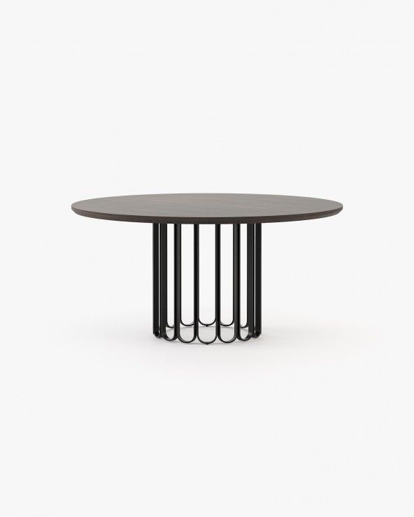 Шерил-это круглый обеденный стол с деревянной столешницей и металлическим основанием, идеально подходящий для украшения столовой прямыми линиями, как контрастное и геометрическое дополнение к украшению.