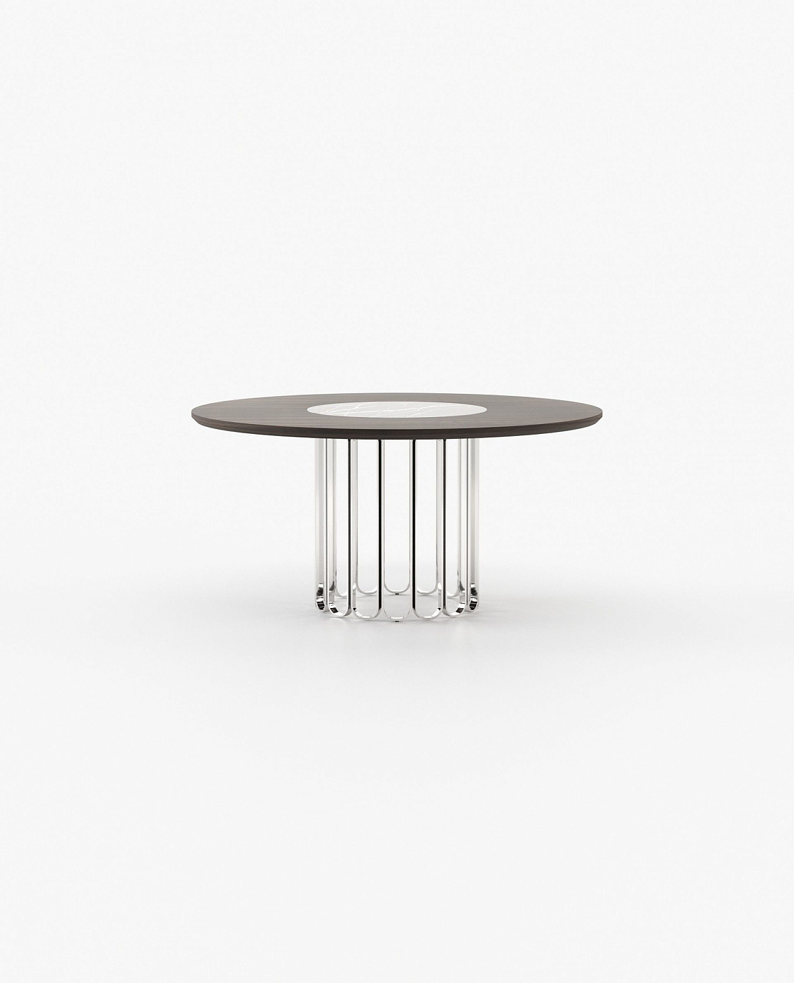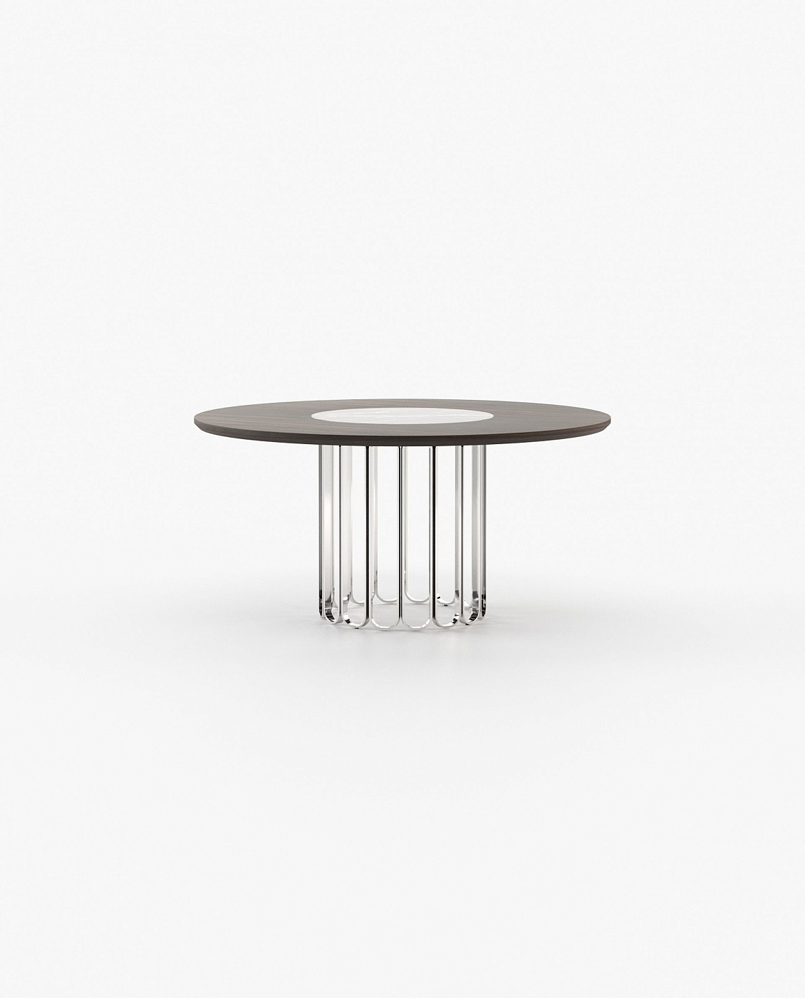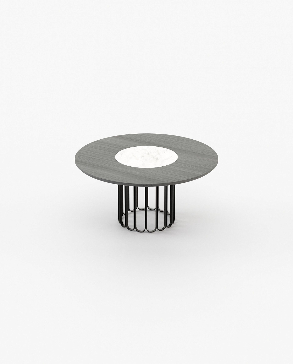 Шерил-это круглый обеденный стол с деревянной столешницей и металлическим основанием, идеально подходящий для украшения столовой прямыми линиями, как контрастное и геометрическое дополнение к украшению.