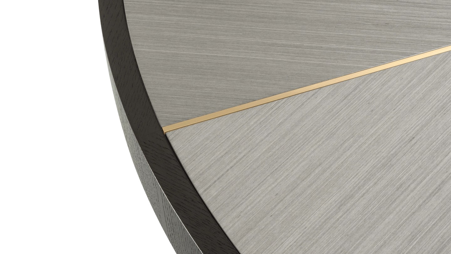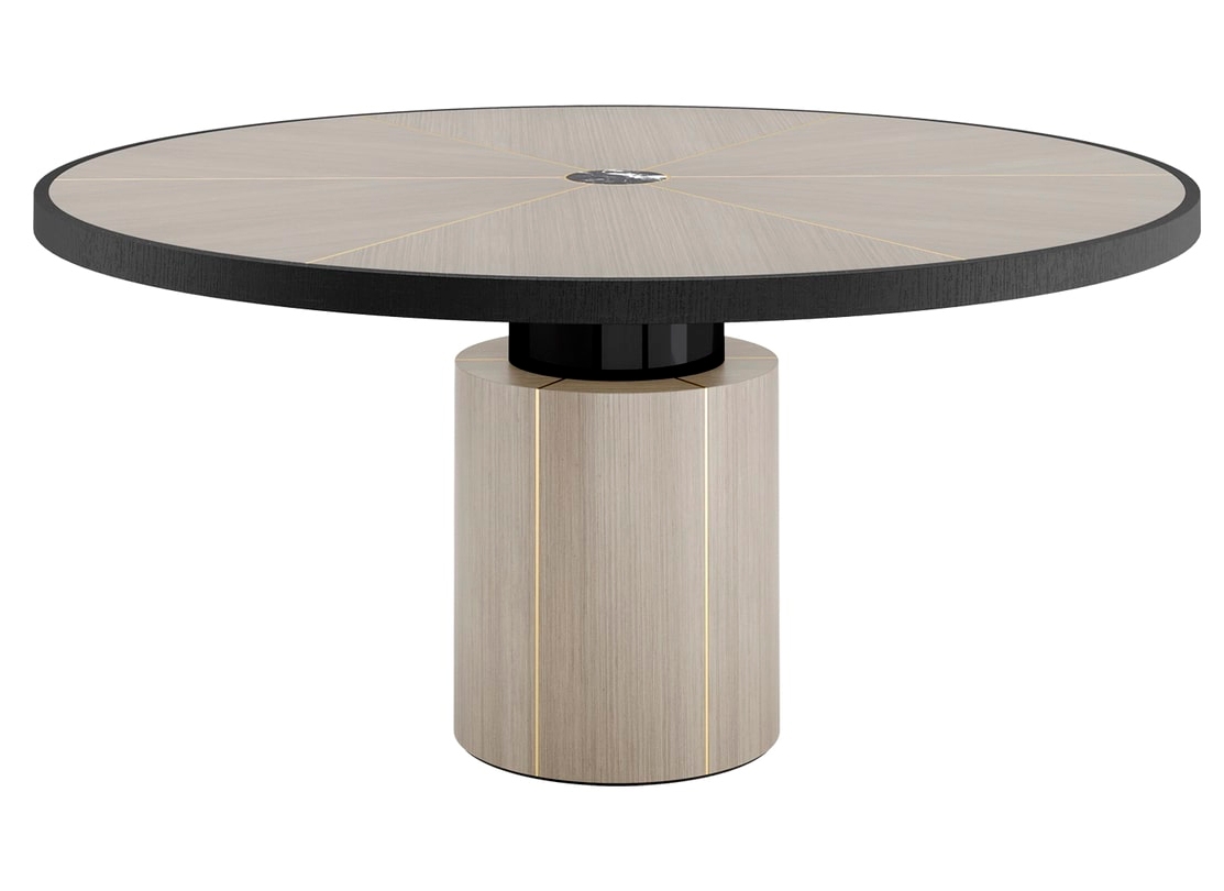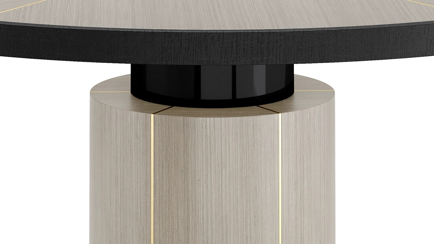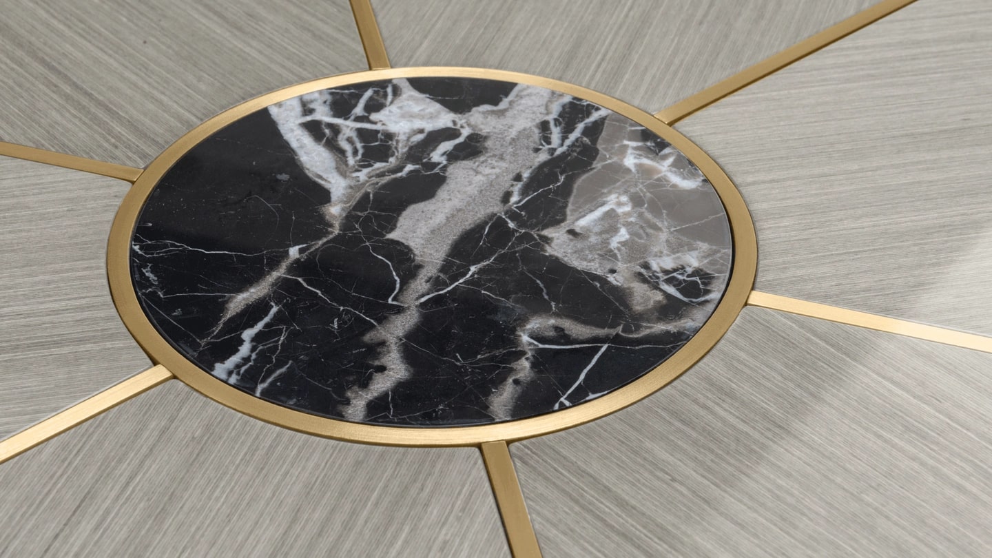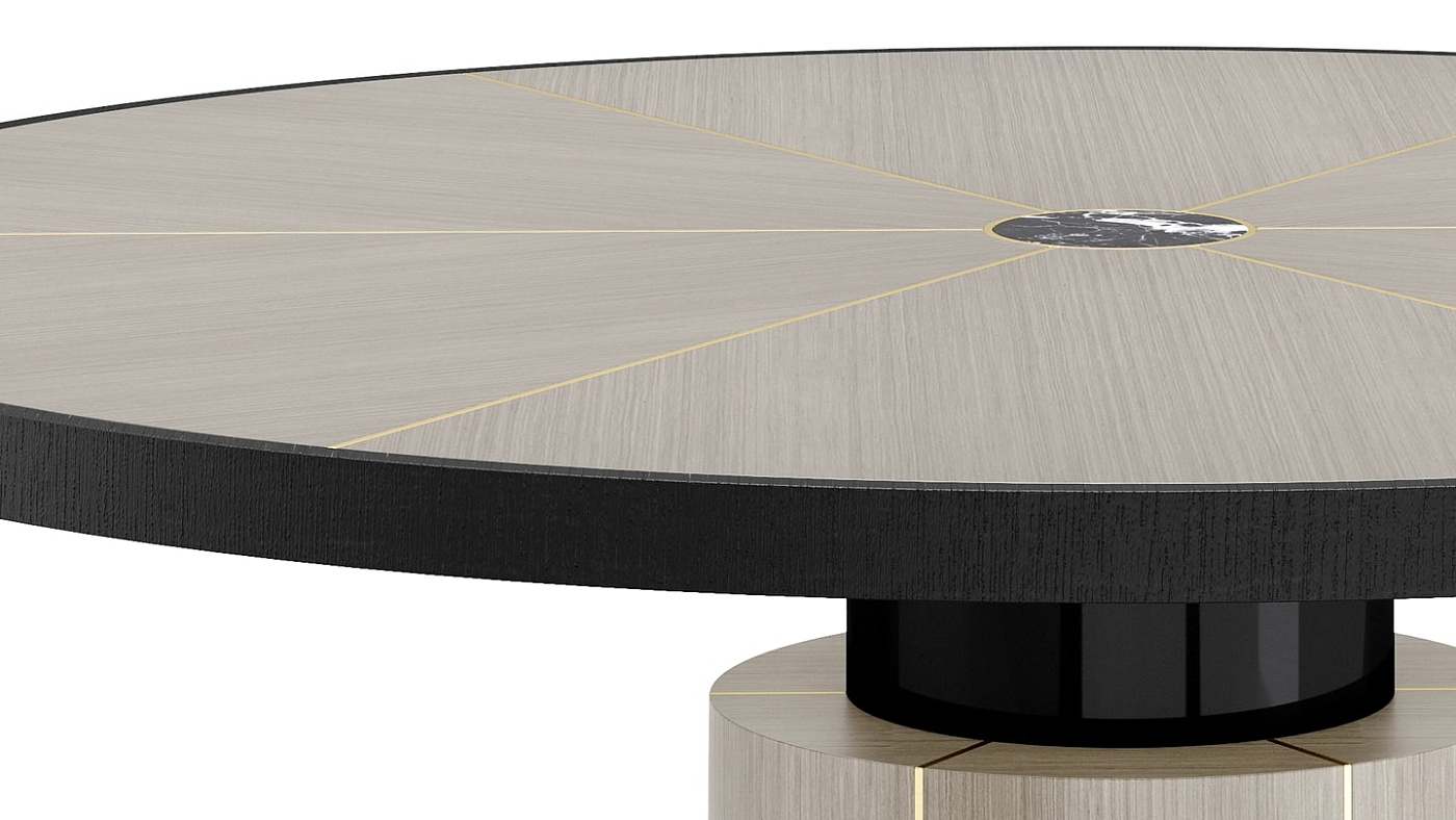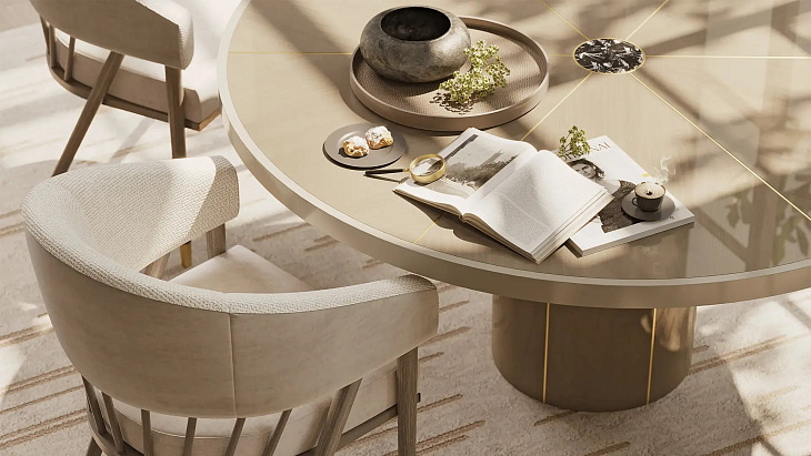 "Сочетая каменную сердцевину со швами из матовой латуни и секциями из деревянного шпона, поверхность обеденного стола RAIPUR привносит нотку экстраординарности в повседневную трапезу".