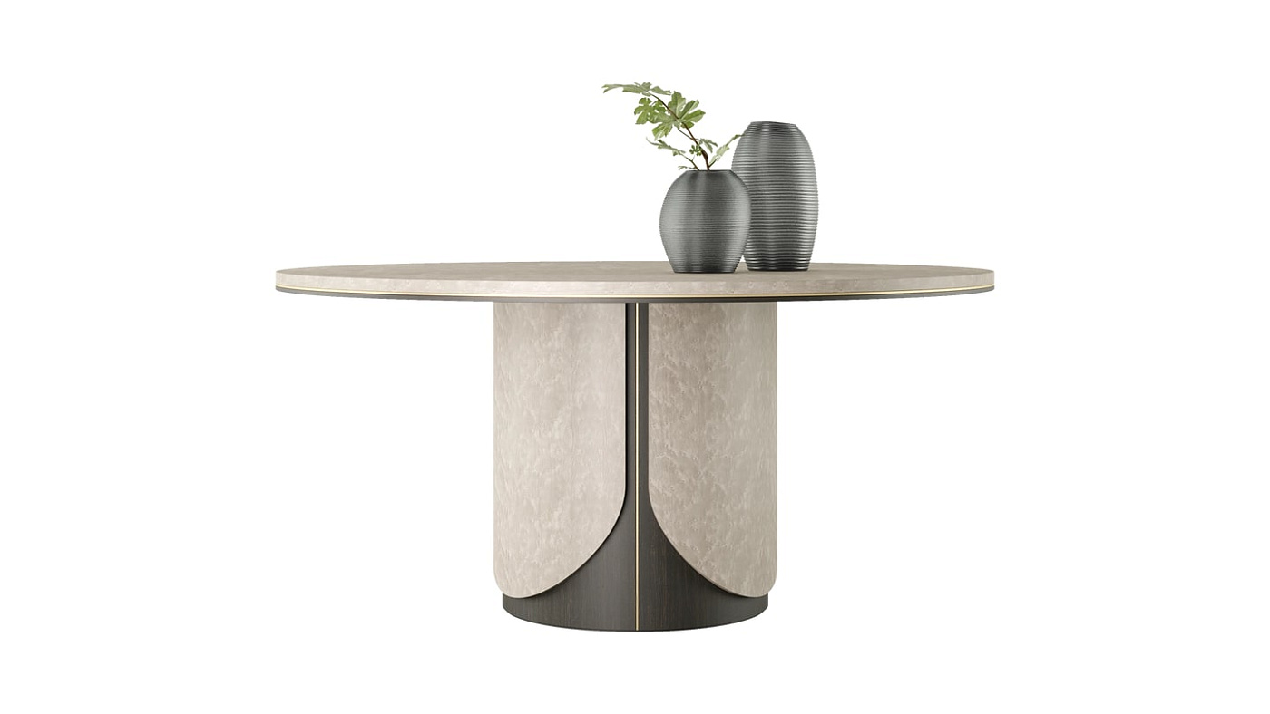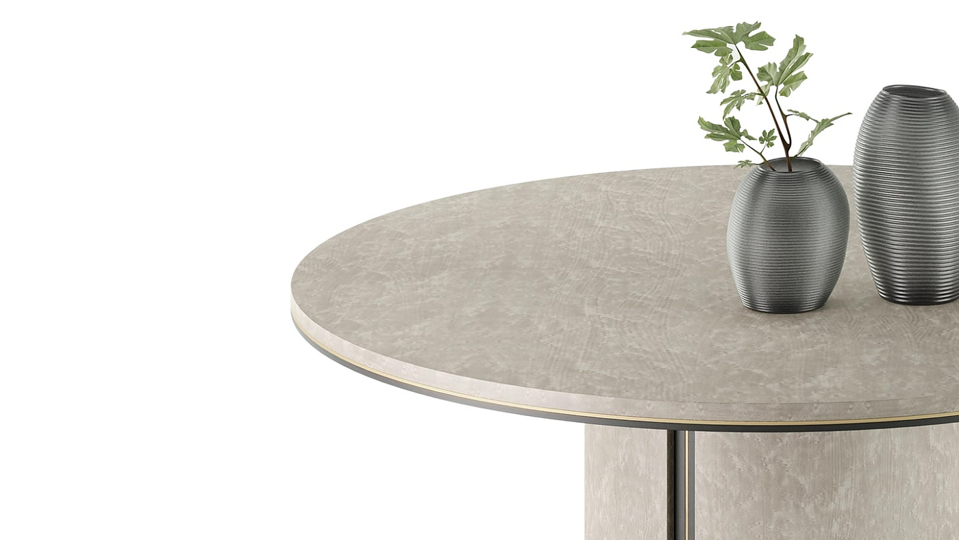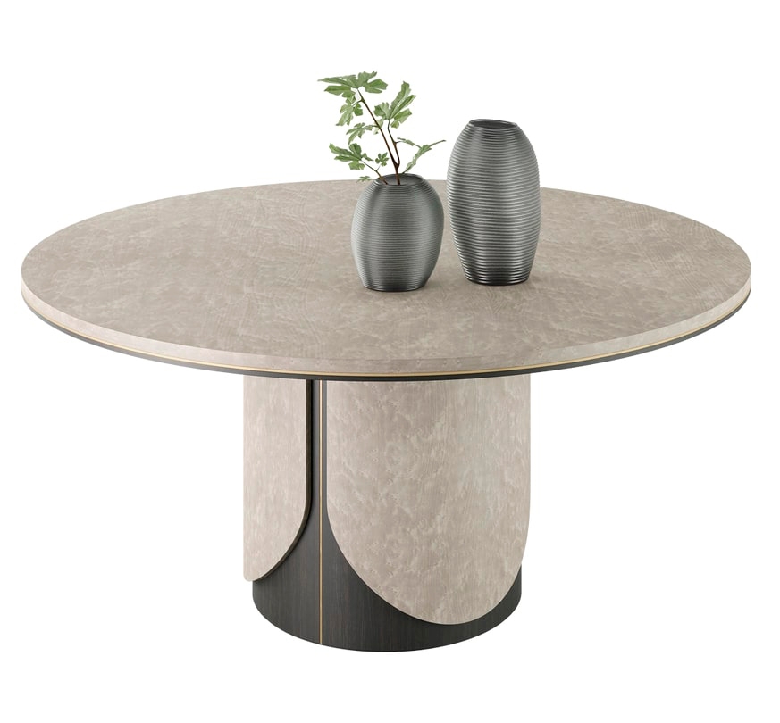 Стильный дизайн TREVISO придает современный вид форме классического круглого обеденного стола с основанием-пьедесталом, играя с темным и светлым шпоном дерева, создавая оптическую иллюзию, которая намекает на альтернативный силуэт.