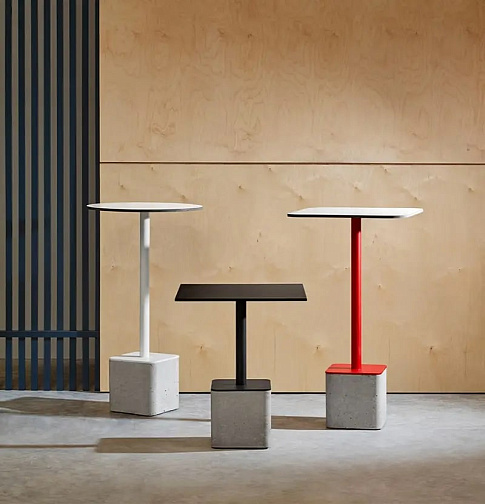 Стол Gus с бетонным основанием и стальным покрытием, покрытым порошковой краской, высота 74 см. Крышка круглой формы. Основание: бетонное основание и стальная конструкция с порошковым покрытием. Крышка: Лист меламинового ламината.