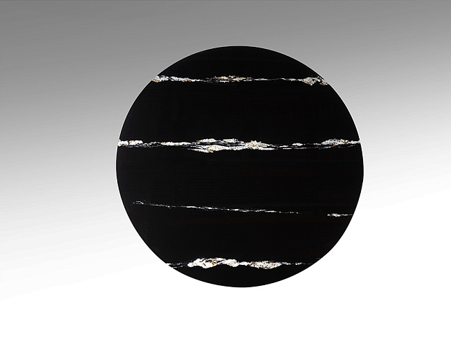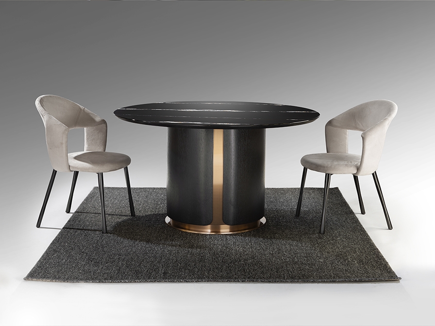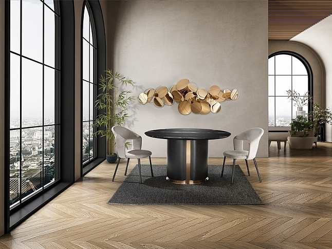 Круглый обеденный стол из МДФ, шпонированного темным дубом, нержавеющей стали с покрытием из розового золота и столешницы из черного мрамора с прожилками.