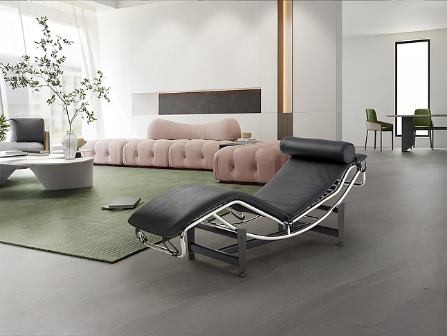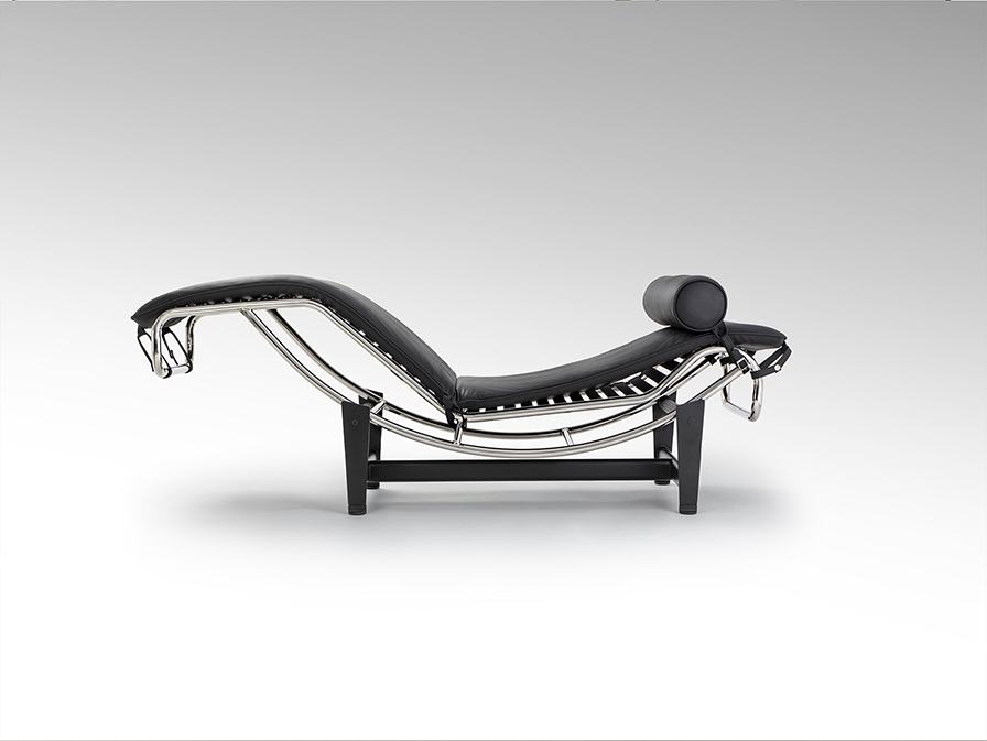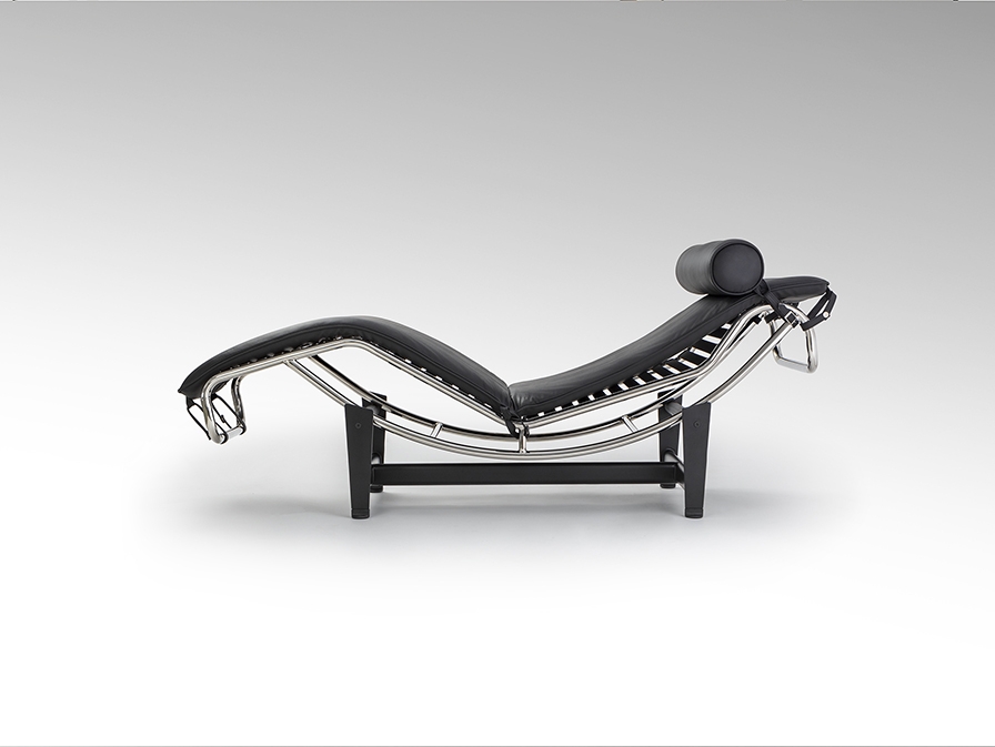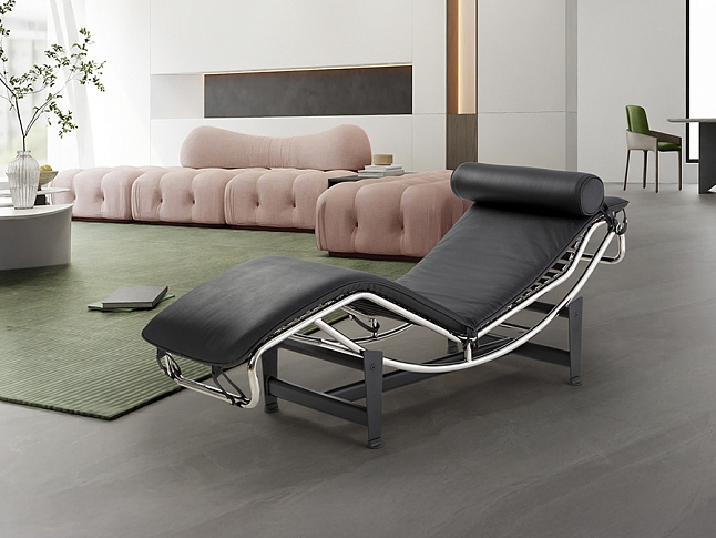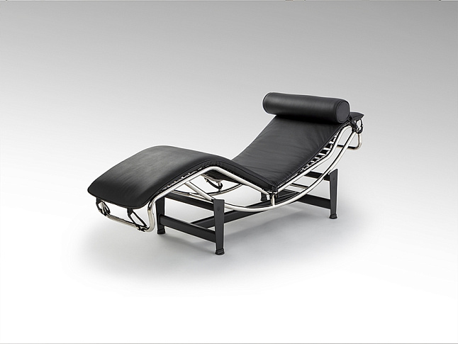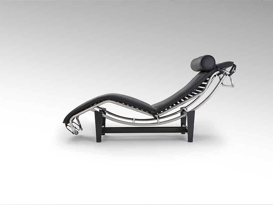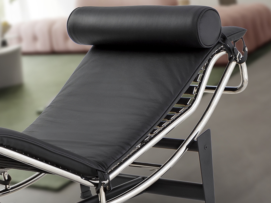 Шезлонг, каркас из хромированной стали, основание из металла чёрного цвета. Откидное сиденье, обитое спереди чёрной кожей, сзади – экокожей.