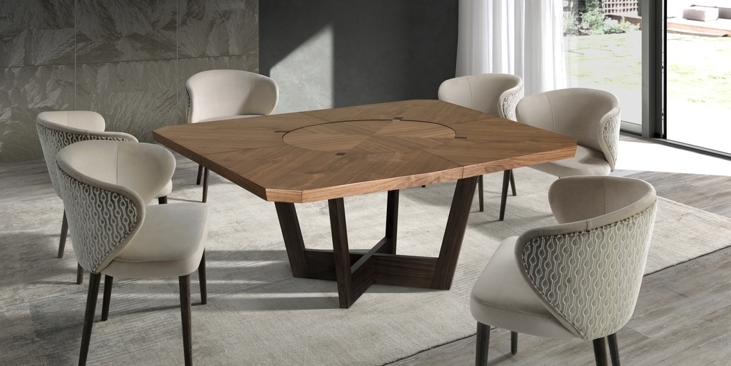 Обеденный стол Coral станет отличным дополнением элегантного интерьера. На столешнице есть вращающийся поднос. Стол доступен в нескольких вариантах отделки.