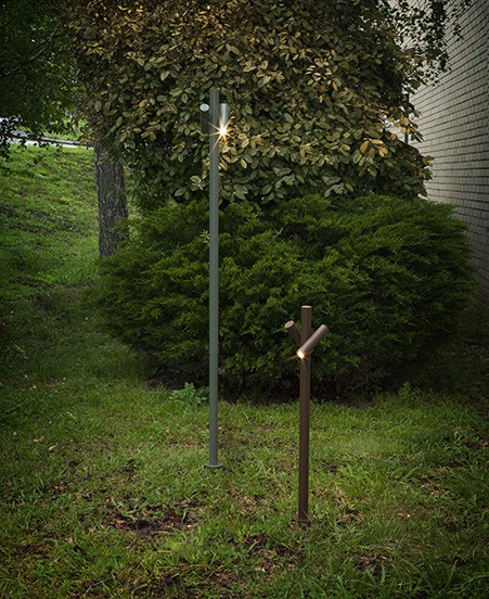 Уличный маяк с вращающейся светодиодной головкой. Отделки: сатин хаки или кортен. Возможность одной или двух световых головок. В качестве аксессуара предлагается шип для установки в саду. Доступен в двух вариантах высоты.