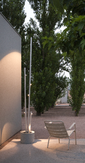 Бамбук — это встраиваемый уличный светильник с двумя рожками. Доступен в трех вариантах отделки — хаки, нержавеющая сталь и не совсем белый — что позволяет маскировать и интегрировать его в ландшафт, а также удивляет тем, что он излучает свет. Дизайн Антони Арола и Энрик Родригес.