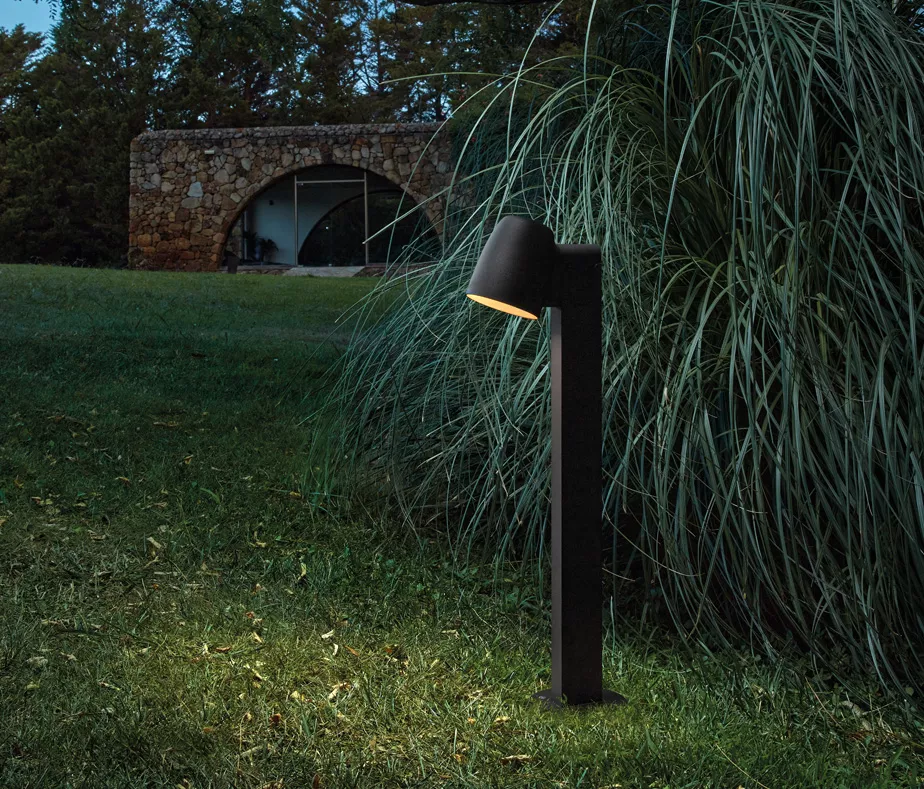 С помощью столбиков Nut мы хотели расширить семейство и вынести столбики в сад, чтобы они смешались с зеленью растений и кустов. Столбики излучают ореол нюансированного прямого нижнего света под углом 55º. Они ненаправленные. Они просты и интуитивно понятны в использовании. Луч света может быть направлен справа налево под углом 180°.