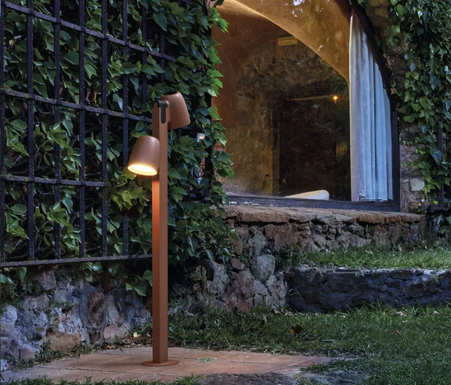 С помощью столбиков Nut мы хотели расширить семейство и вынести столбики в сад, чтобы они смешались с зеленью растений и кустов. Столбики излучают ореол нюансированного прямого нижнего света под углом 55º. Они ненаправленные. Они просты и интуитивно понятны в использовании. Луч света может быть направлен справа налево под углом 180°.
