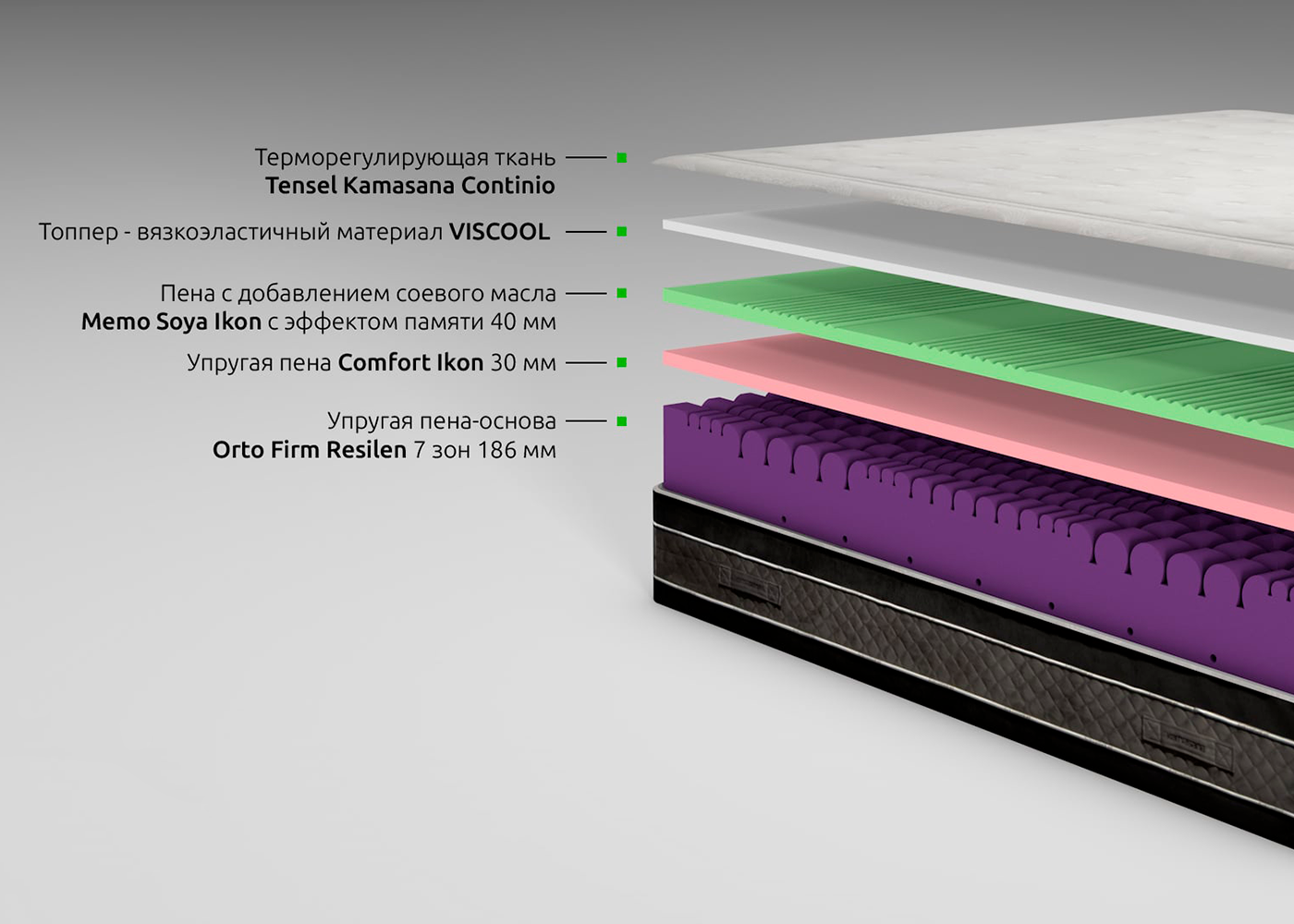 Строгий внешне и роскошный внутри новый матрас Altea – это результат соединения современного дизайна с точно рассчитанной комбинацией слоев разных уровней мягкости. Терморегулирующая ткань Tencel - материал, который изготавливают из древесины эвкалипта. Его производство является искусственным и безотходным, что позволяет не наносить вреда окружающей среде. Такая ткань обладает высокими капиллярными свойствами, что позволяет создавать комфортный микроклимат в зоне сна. Матрас изготовлен по идеальной формуле LUX COMFORT MEDIUM FIRM. Мягкие анатомические верхние слои материалов с эффектом памяти и нижний несущий материал-основа Orto Firm Resilen®, создающий ортопедическую поддержку высочайшего уровня.