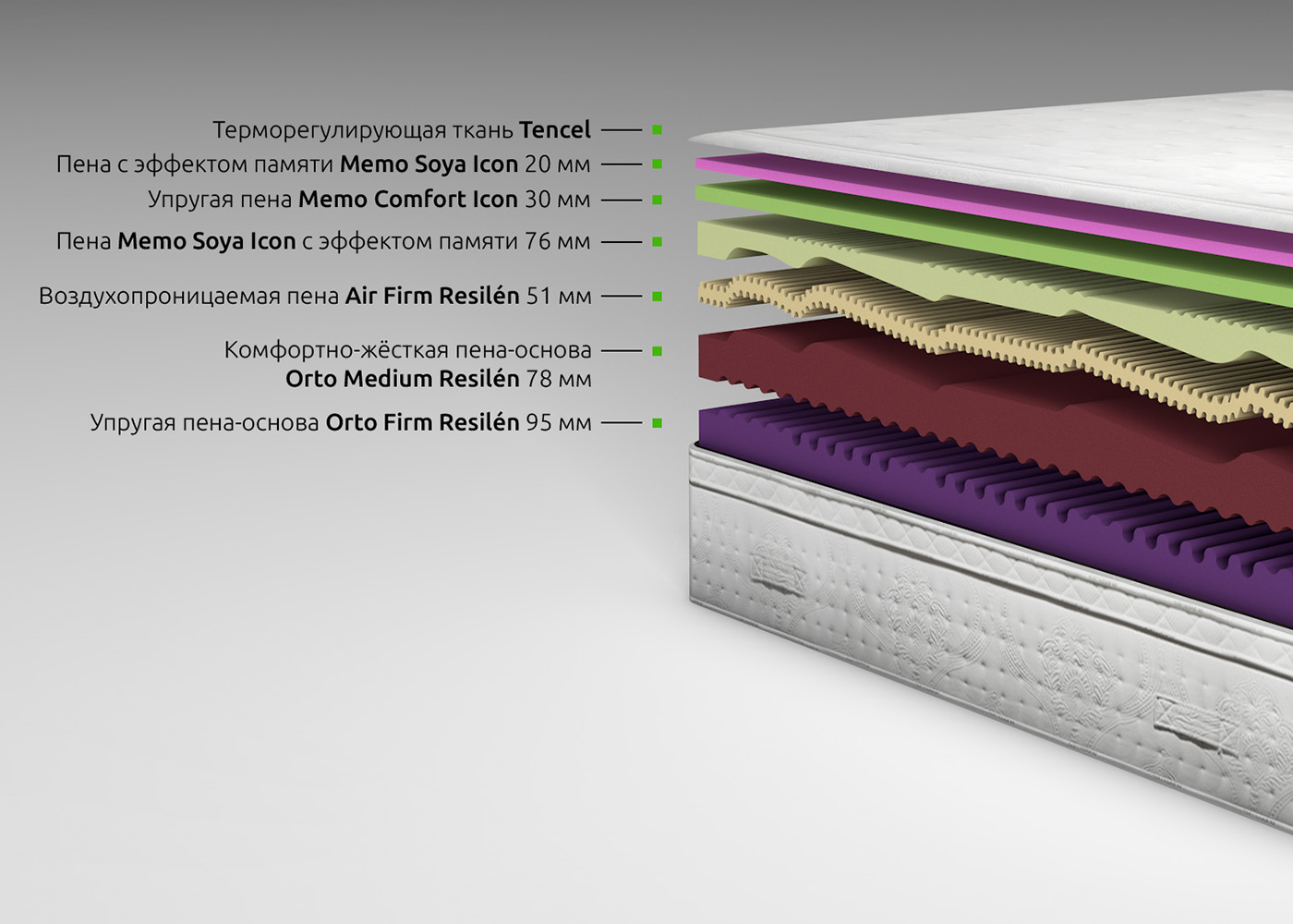 Матрас состоит из основного блока и топпера, изготовленного из вязкоэластичных материалов с эффектом памяти, которые соединяются между собой при помощи «молнии». Блоки так же могут использоваться как самостоятельные изделия. Верхний слой основного блока Memo Soya Ikon® с добавлением соевого масла обладает эффектом памяти, отлично дышит и самое главное— обеспечивает высокий анатомический эффект, практически снимая обратное давление на тело человека со стороны матраса. Дополнительно он профилирован, за счёт чего создаётся лёгкий массажный эффект и улучшает воздухообмен.