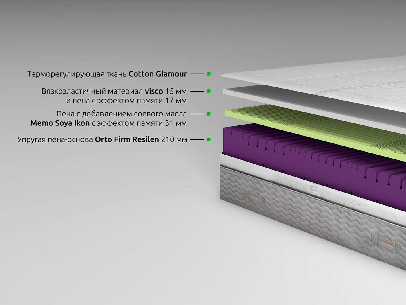 В этом матрасе мы постарались совместить две характеристики: комфортную мягкость верхнего слоя и уверенную поддержку нижнего. Верхний слой матрасного блока Memo Soya Ikon® с добавлением соевого масла обладает эффектом памяти, отлично дышит и самое главное — обеспечивает высокий анатомический эффект, практически снимая обратное давление на тело человека со стороны матраса. Дополнительно он профилирован, за счёт чего создаётся лёгкий массажный эффект и улучшается воздухообмен. Несущий нижний слой материала основы с высокой компрессионной устойчивостью, в сочетании с верхним мягким анатомическим слоем, создаёт идеальную поддержку спины с умеренным уровнем комфорта. Деление нижнего блока на анатомические зоны придаёт матрасу оптимальную эргономику и адаптацию матраса в местах значительных весовых нагрузок.