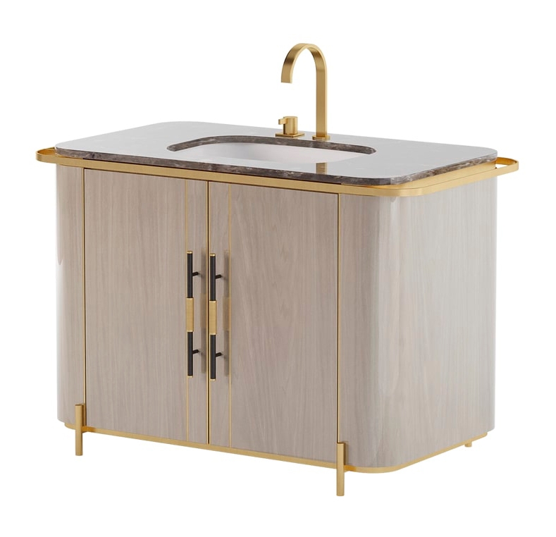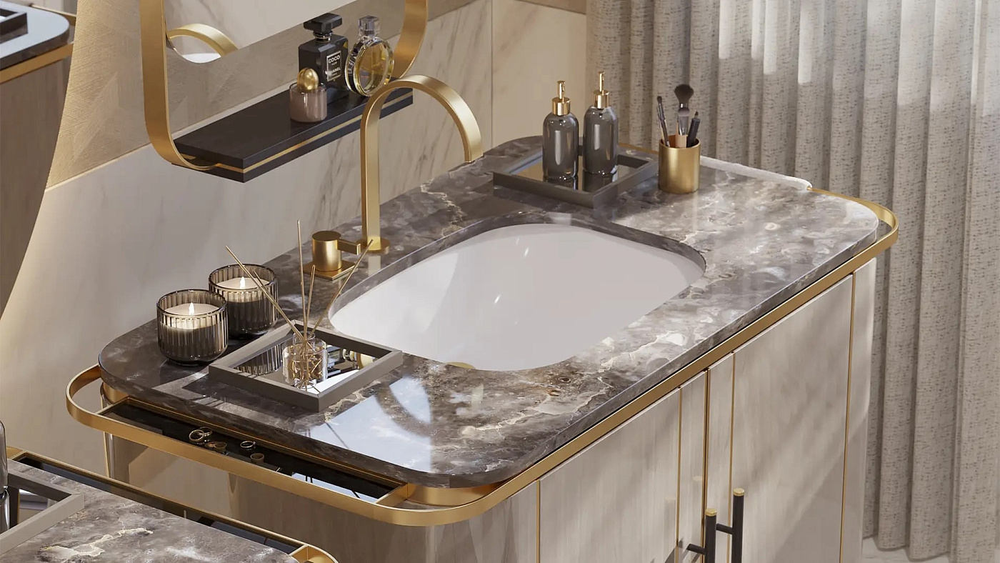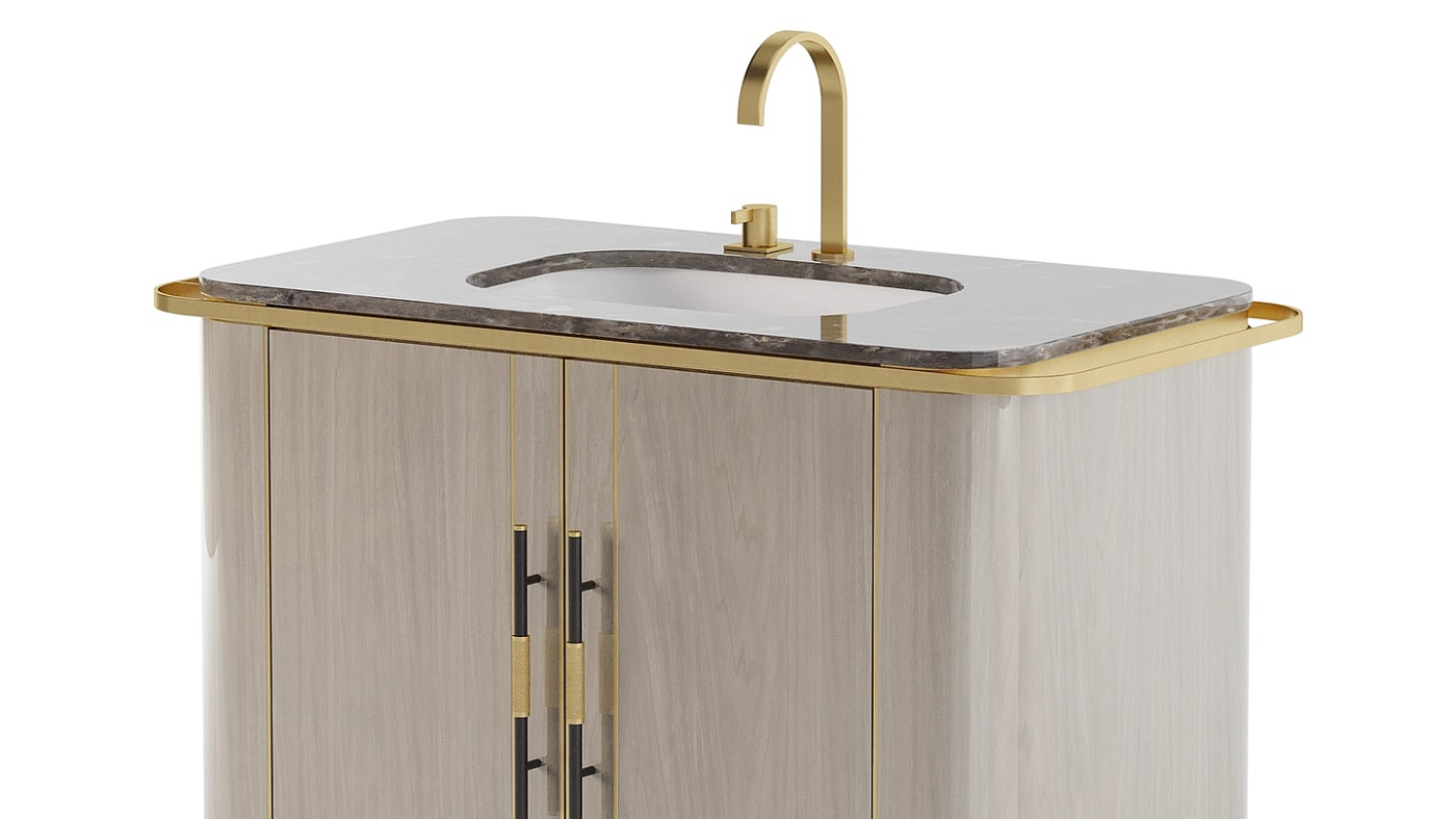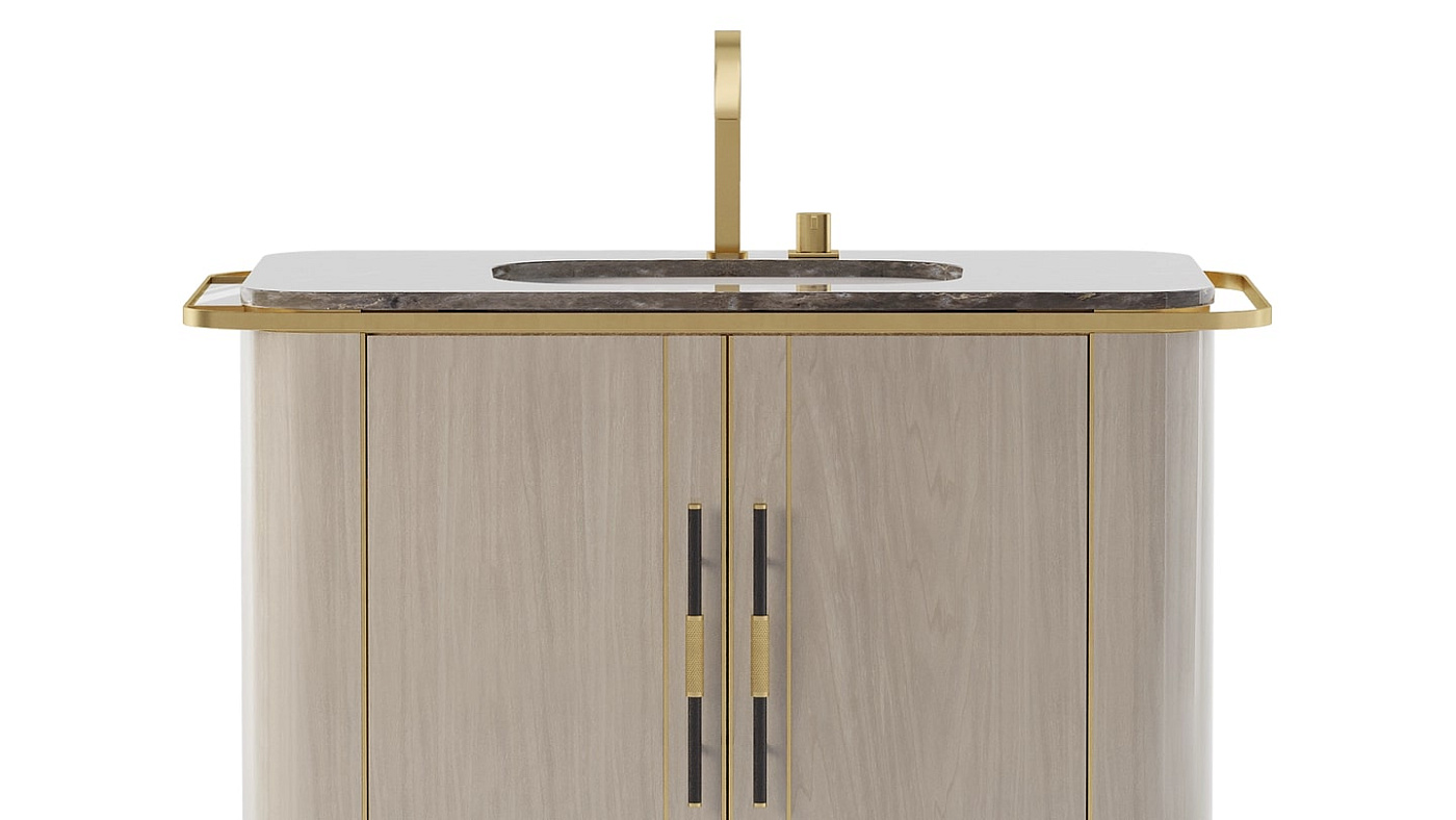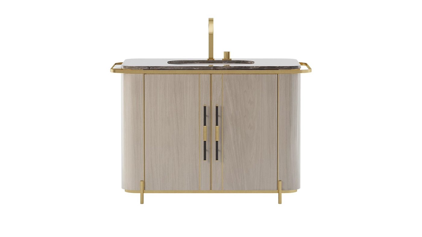 Двухдверный туалетный столик BONDI, выполненный из роскошного сочетания глянцевого шпона и камня с натуральным рисунком, имеет тонкую рамку вокруг поверхности, которая придает ему интерес, и место для развешивания полотенец.