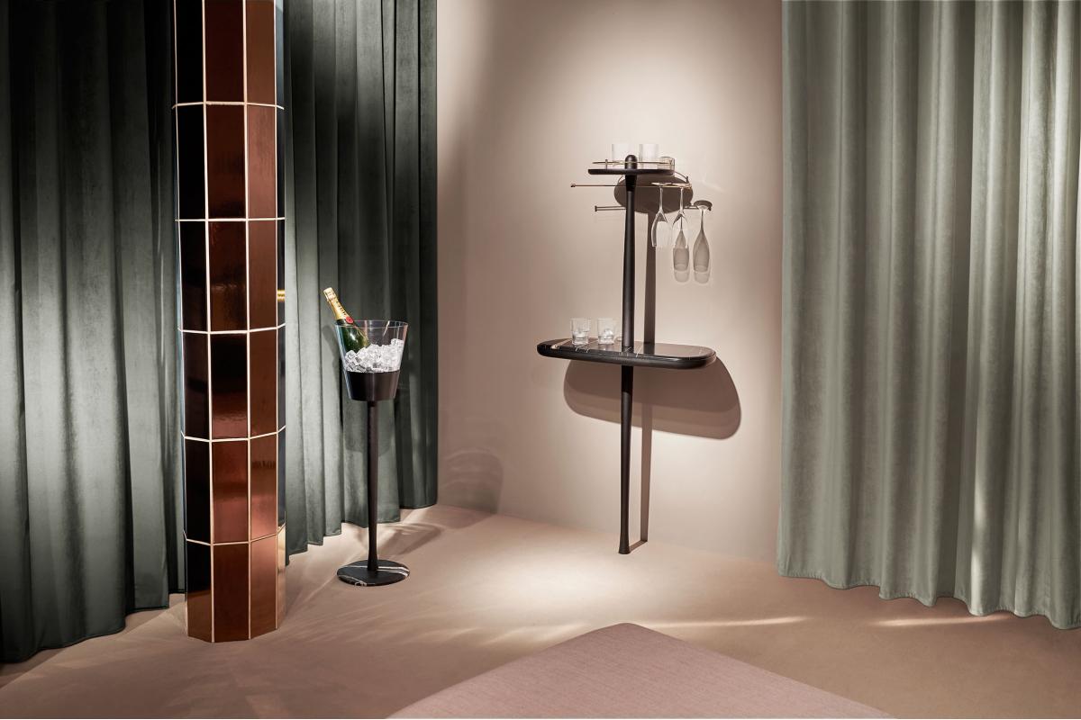 С помощью этого продукта создается пространство, для отдыха в хорошей компании. Кроме того, мраморная столешница и подвесные чашки из золотых стержней напоминают классические барные шкафы.