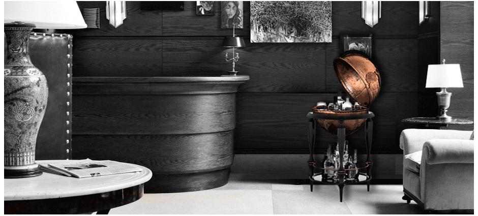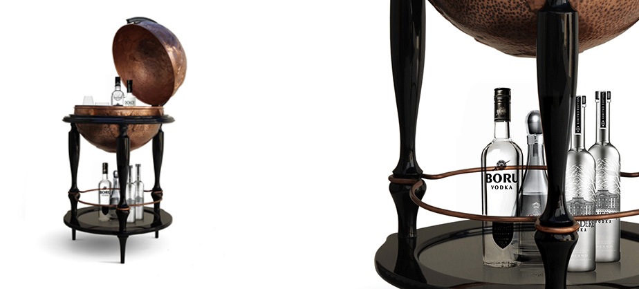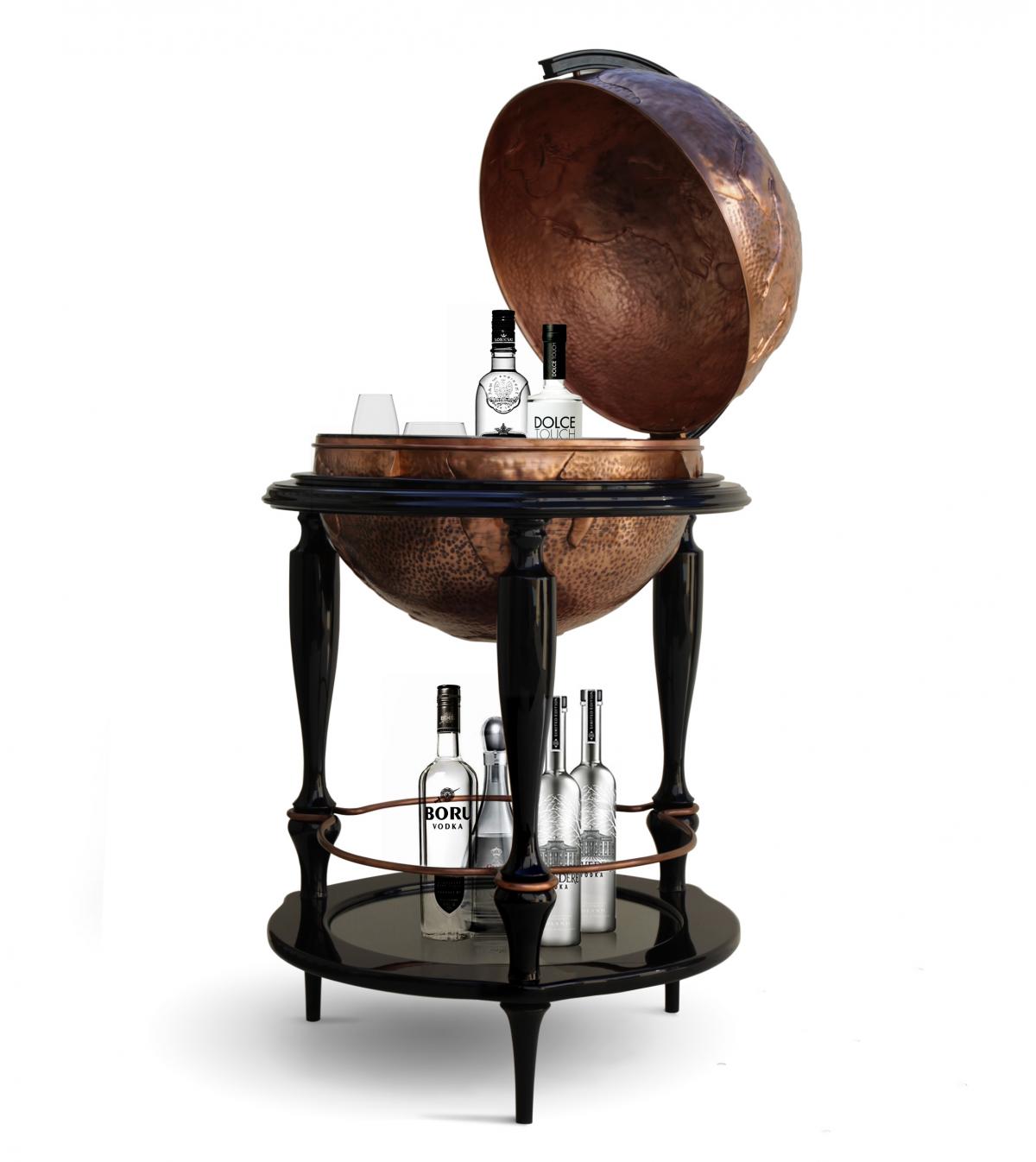 Бар Equator от португальского бренда Boca do Lobo возвращает нас в XVI век, эпоху путешествий и великих географических открытий. В те времена глобус был самой важной вещью в жизни мореплавателя. Бар Equator предоставляет уникальную возможность почувствовать атмосферу того времени. Он идеально подойдет для эксклюзивного интерьера столовой или гостиной комнаты. Глобус, представляющий сбой главную часть бара, выкован вручную из меди (точно такая же техника ковки применяется для создания столика Wave). Внутри открывающегося глобуса предусмотрены емкости для бокалов и бутылок. Каркас бара изготовлен из массива дерева и покрыт глянцевым черным лаком. Нижняя столешница изготовлена из стекла.