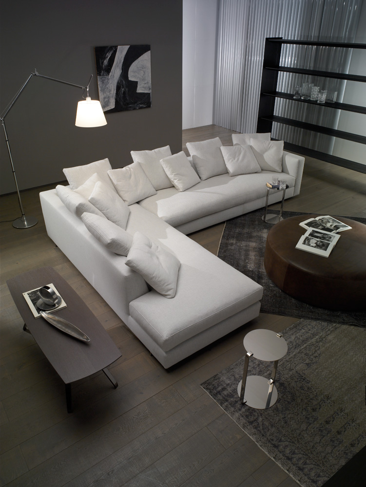 Для Alex характерна концепция сидений современного дизайна, в котором большое количество подушек, которые он включает, позволяет вам поиграть с глубиной сидений. Кроме того, таким образом можно противопоставить его формальную квадратную структуру с неформальностью распределения подушек. Программа включает в себя множество модулей, которые в совокупности позволяют создавать всевозможные композиции, чтобы приспособиться к любой потребности проекта. Каркас дивана выполнен из дерева, подушка сиденья и спинки обита полиуретаном и покрыта защитным слоем, наполненным пухом и перьями белой утки. Задние подушки имеют защитный слой с внутренними подразделениями, заполненными полиэфирным волокном и утиными перьями и пухом. Чехол полностью съемный. Отвинчивающиеся ножки из нержавеющей стали, полированные или матовые.