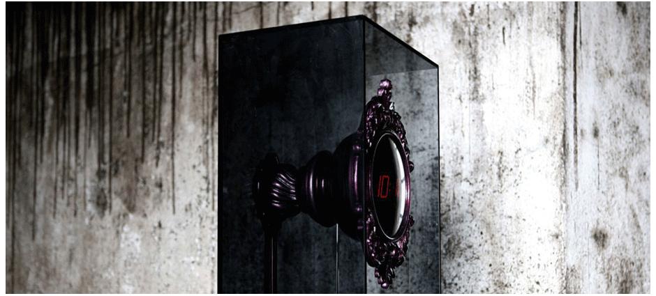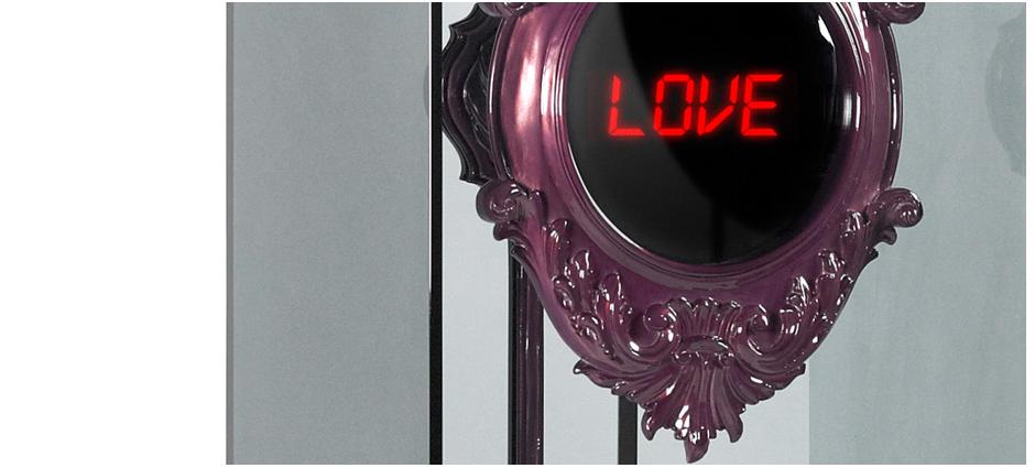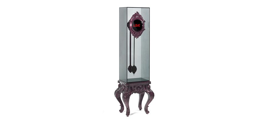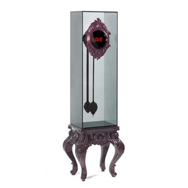 Электронные часы, циферблат которых обрамлен резной рамкой из красного дерева. Их маятник, как и механизм, заключен в бокс из дымчатого стекла. Основание часов изготовлено из красного дерева, покрыто тонким слоем серебра и двумя видами лака: ярким аметистовым и полупрозрачным дымчатым.