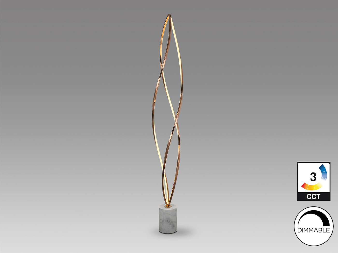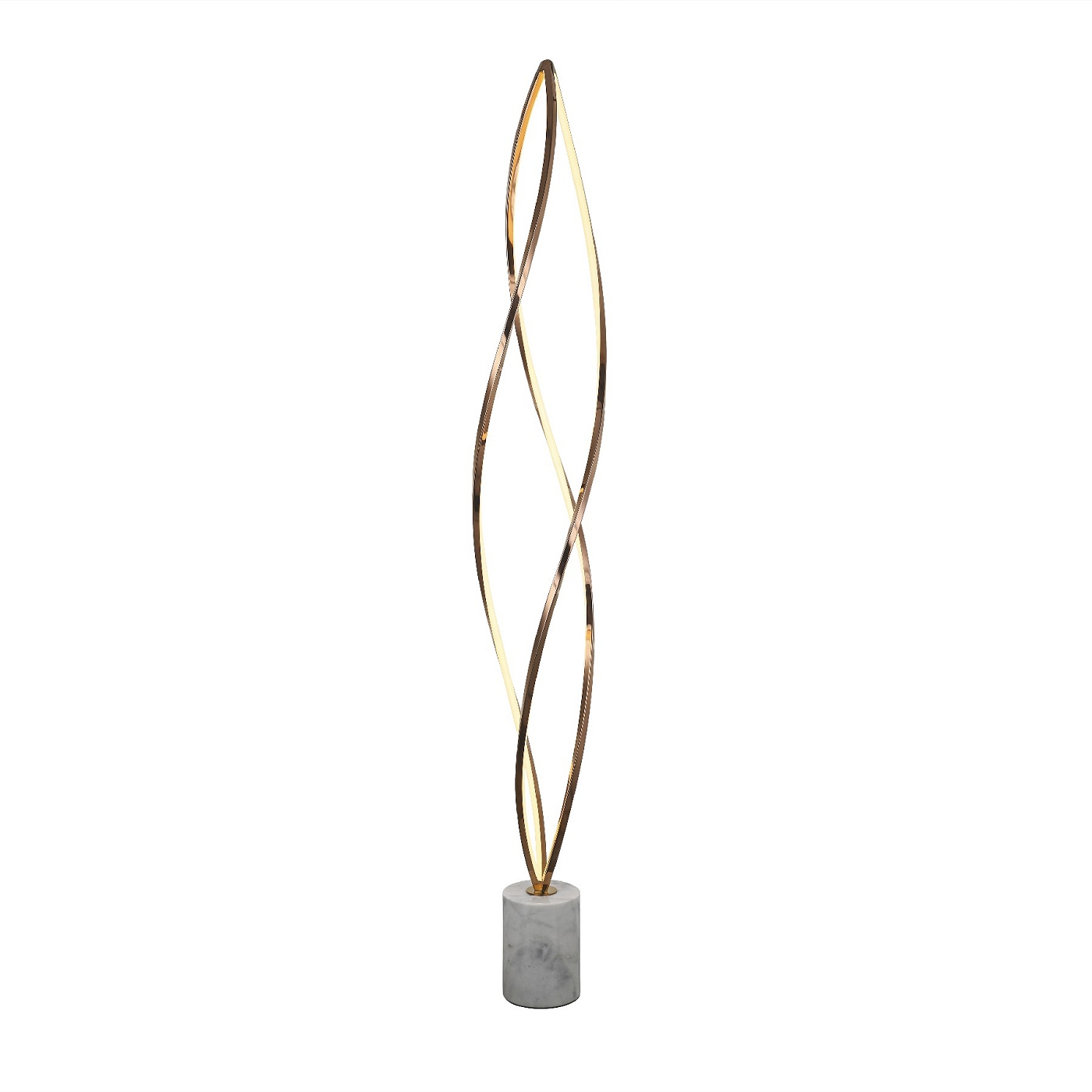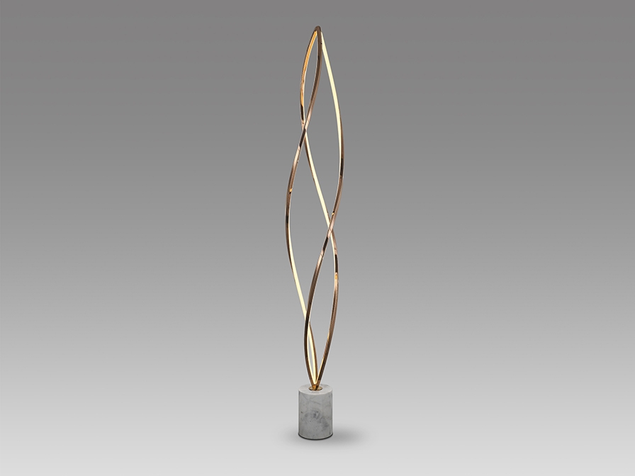 Торшер из стали с отделкой из блестящего розового золота и основанием из белого мрамора. Опаловый акриловый рассеиватель. Светодиодное освещение мощностью 60 Вт, 2700 К. С возможностью регулировки яркости.