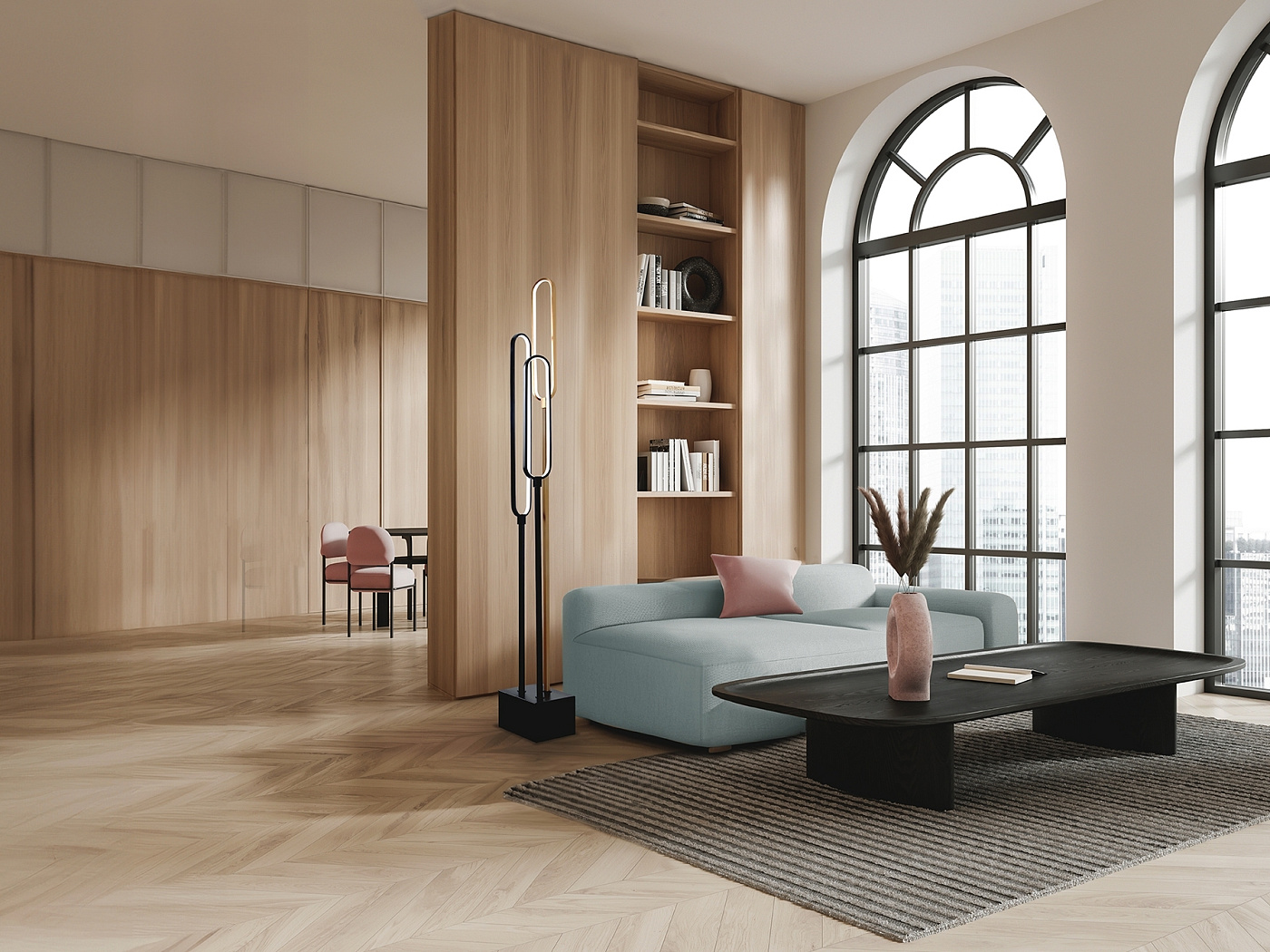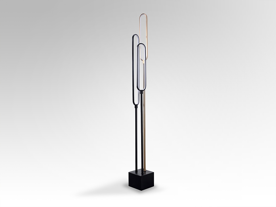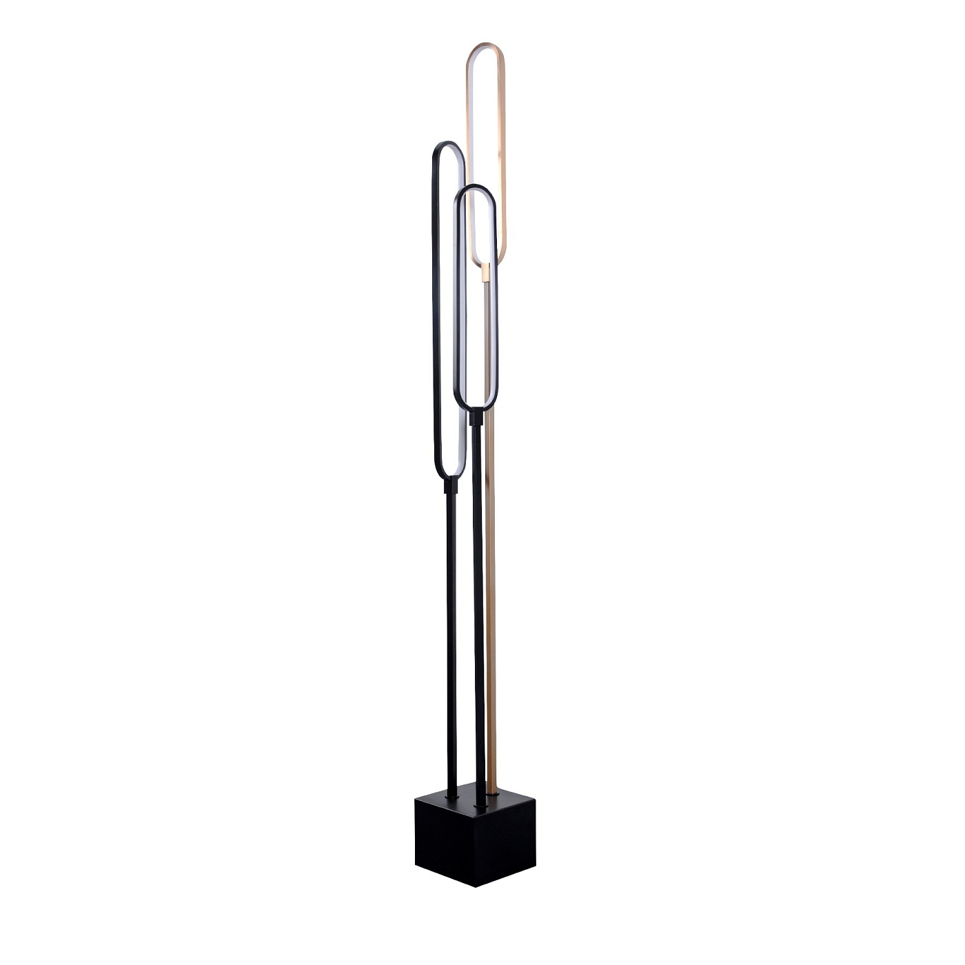 Торшер с 3 светодиодными лампами, изготовленный из матового алюминия и металлического основания. Отделка под розовое золото и матовый черный цвет. Опаловые силиконовые рассеиватели. Светодиод мощностью 44 Вт, 3042 лм, 3000 К.